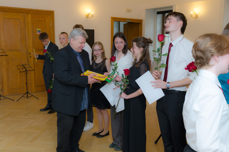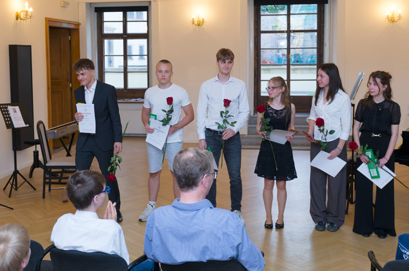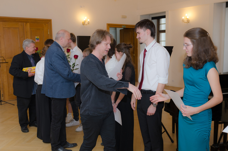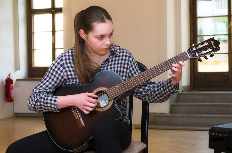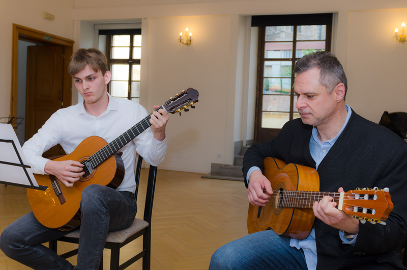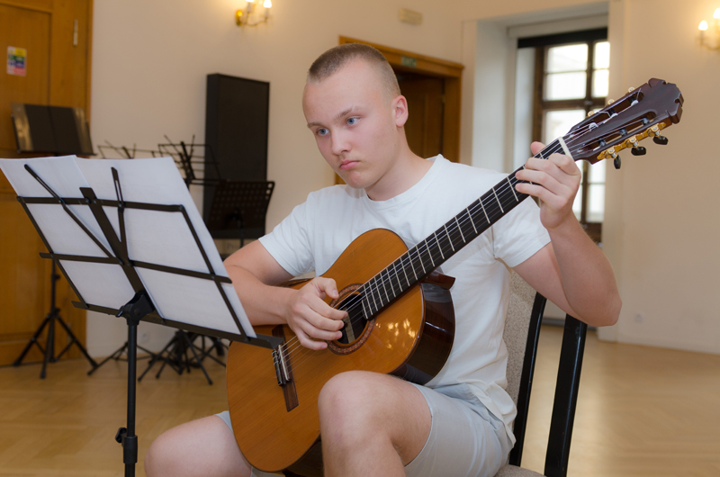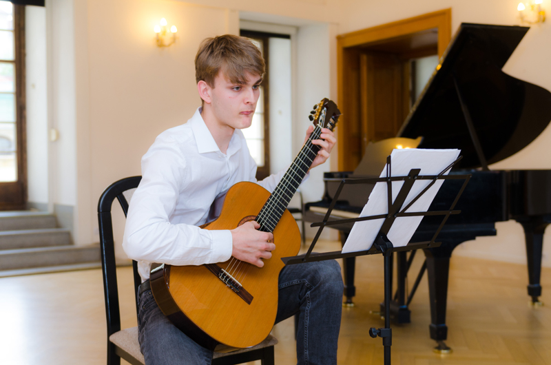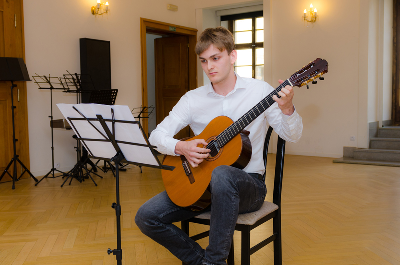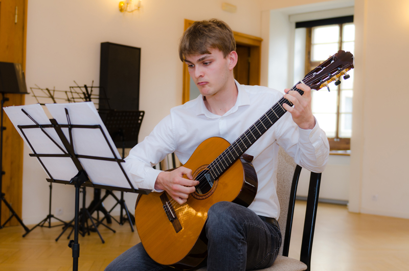 David Neugebauer (7. r.) hrál na kytaru Preludium Maura Giuliani, Andante Ferdinanda Carulli, Estudios Sencillos Leo Brouwera a společně se svým p. učitelem Tradicionál Scarborough Fair. Učitelem hry na kytaru Davida je p. učitel Dalibor B. Hanusek.