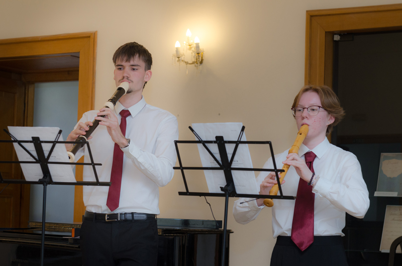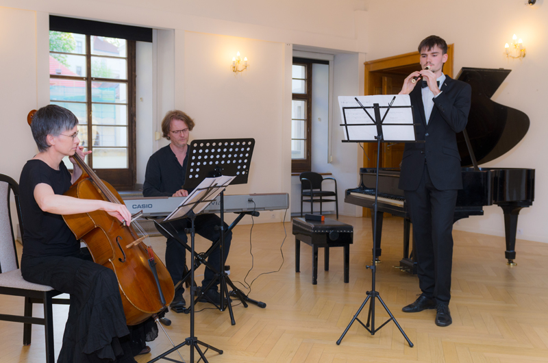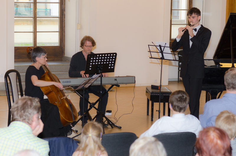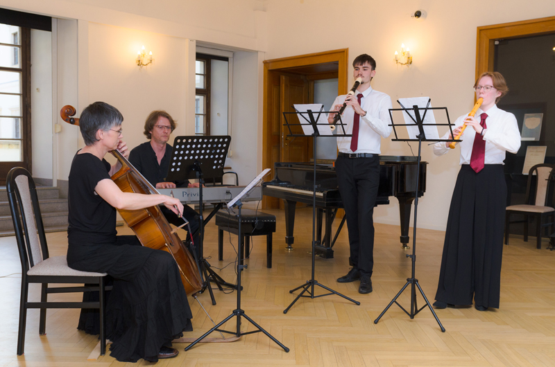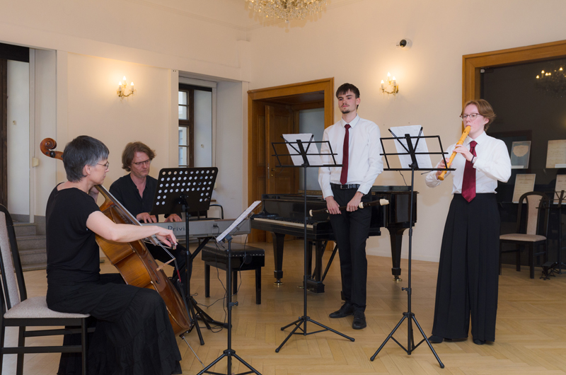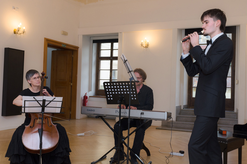 Lukáš Buček (7. r.) přednesl na sopránovou zob. flétnu Adagio a Allegro z Triové sonáty F dur Johanna Christopha Pepusche. Společně s ním hrála s tenorovou zob. flétnou Lucie Oleksíková (5. r.), paní Eva Hovorková na violoncello a pan Marek Paľa na klávesy ve stylu cembala. Lukáš i Lucie studují hru na zob. flétny ve třídě p. učitele Petra Zapletala, paní Eva Hovorková je členkou souboru Brněnská camerata, kterou umělecky vede p. P. Zapletal.