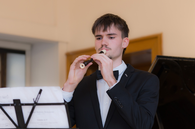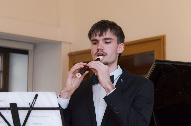 Lukáš Buček (4. r. II. st.) hrál na zobcovou flétnu sopraninu Sonátu F dur autora Giovanni Bononcini. Na violoncello s ním hrála paní Eva Hovorková s p. Markem Paľou na klávesy