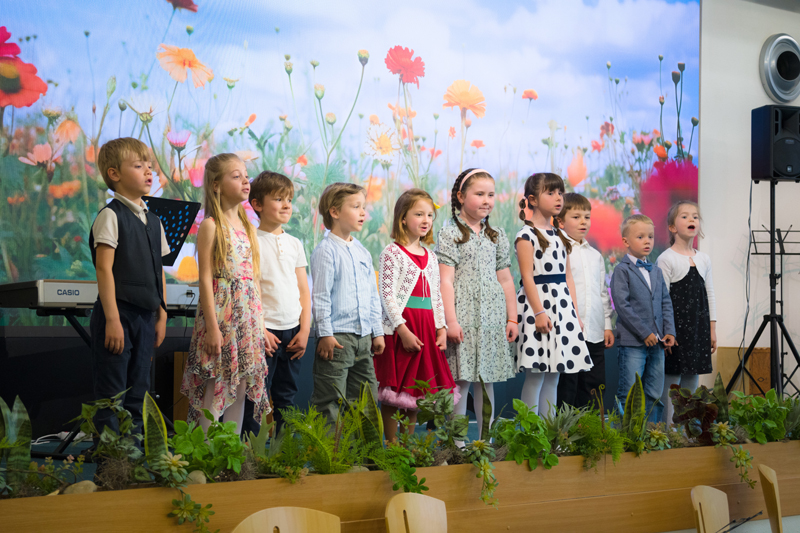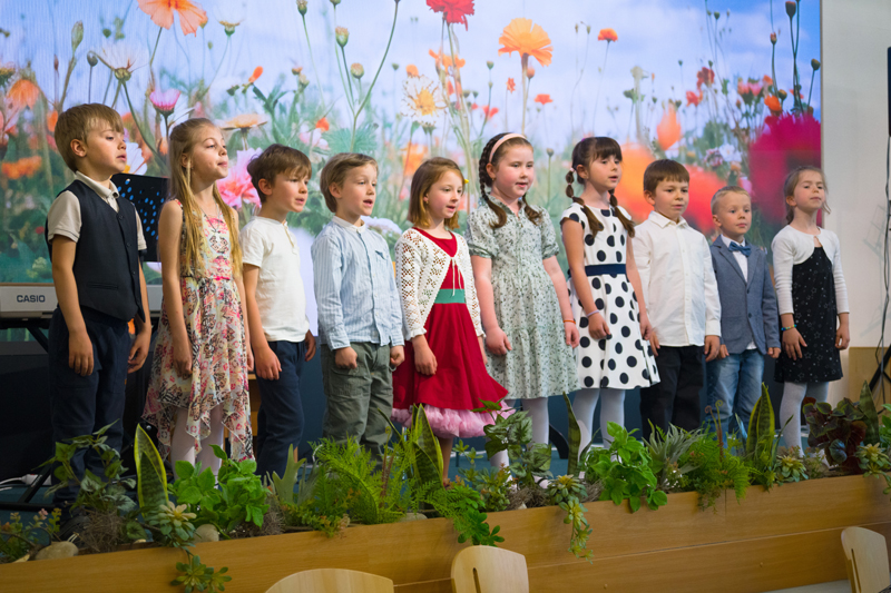 Úvod koncertu patřil samozřejmě našim nejmladším dětem, členům pěveckého sborečku Veverčata, vedené p. sbormistryní Martinou Kirovou. Děti zpívaly píseň Petra Ebena Foukej větříku a píseň Čáp Zdeňka Lukáše. Svůj zpěv děti podpořily rytmickým klepáním ozvučnými dřívky. Klavírní doprovod Saskie Horáková.