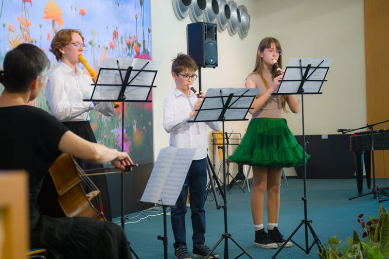 Barokní hudbu představili žáci p. učitele Petra Zapletala hrou na zob. flétnu: Aneta Holčapková (5. r.), Radovan Holčapek (4. r.) a Lucie Oleksíková (1. r. II. st.). Společně s nimi hrou na violoncello jejich hru obohatila p. Eva Hovorková j. h. a na klávesy ve stylu cembala hrál