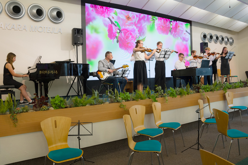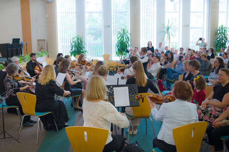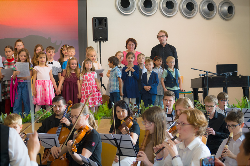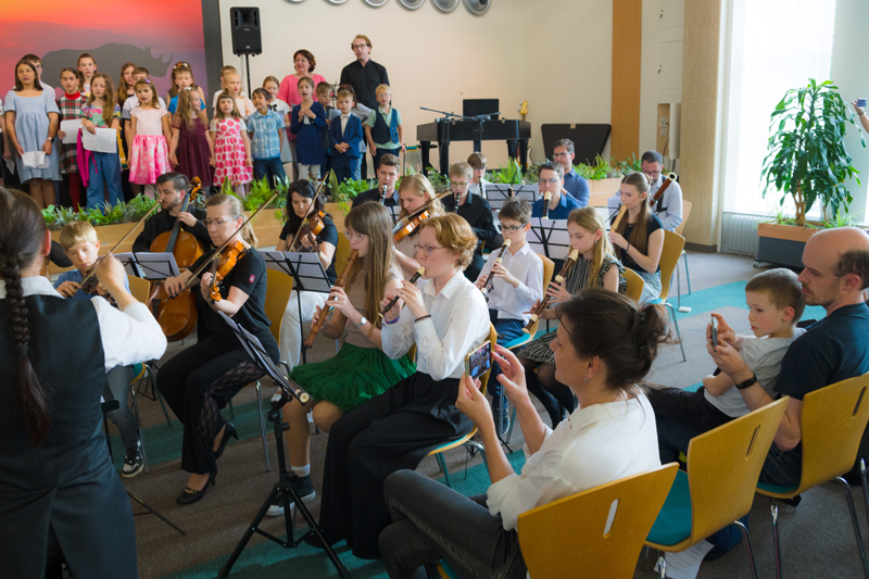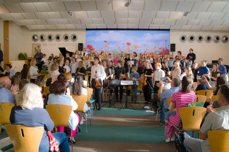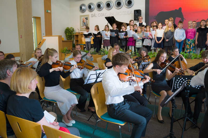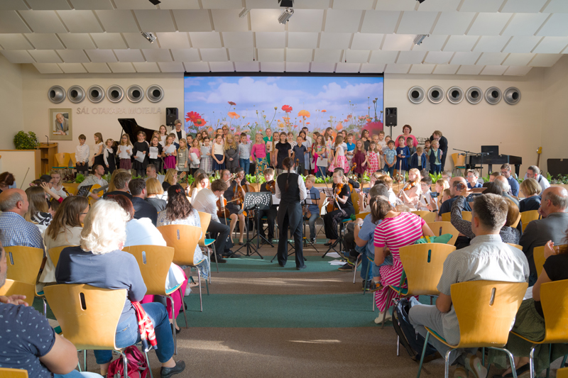 a učitelé ve spojeném orchestru ZUŠ Ježkova, ZUŠ Slunná, Brno a hosté z Brněnské cameraty, sólový klavír výborně zahrál Jan Buchta, student ZUŠ Slunná (žák p. učitelky Jany Nevoralové) v citlivé souhře s orchestrem. Dirigovala p. Kamila Zenklová.