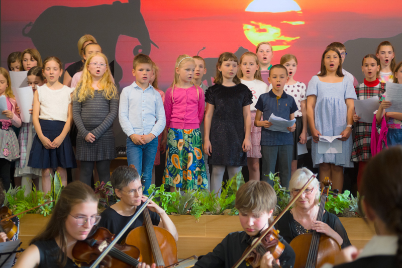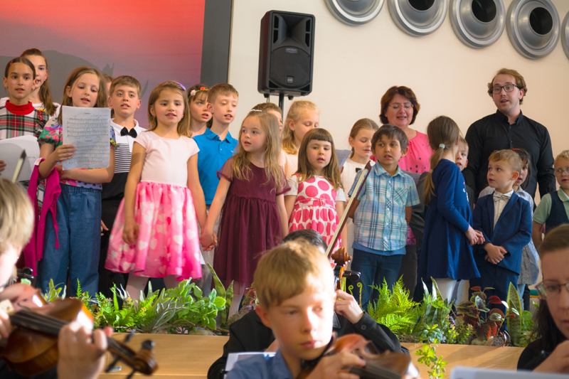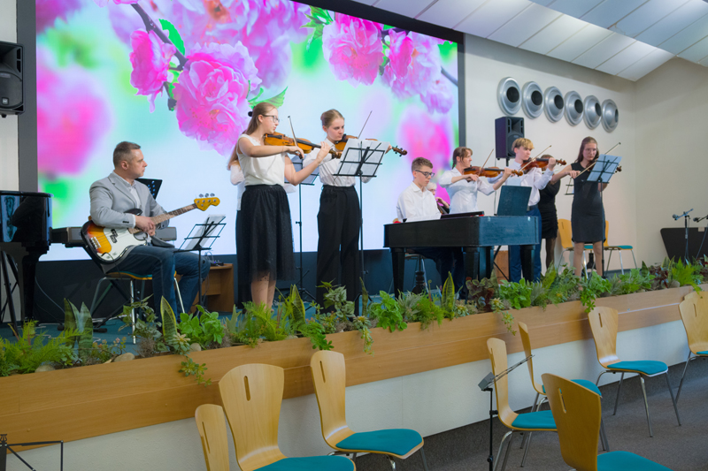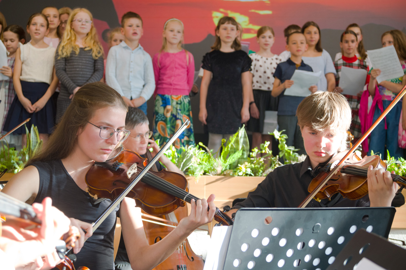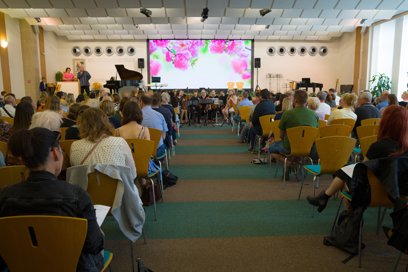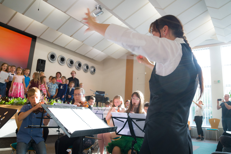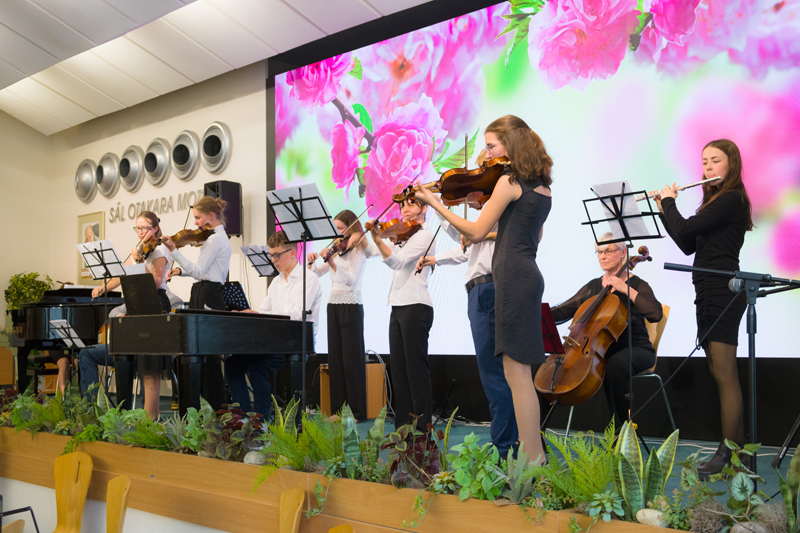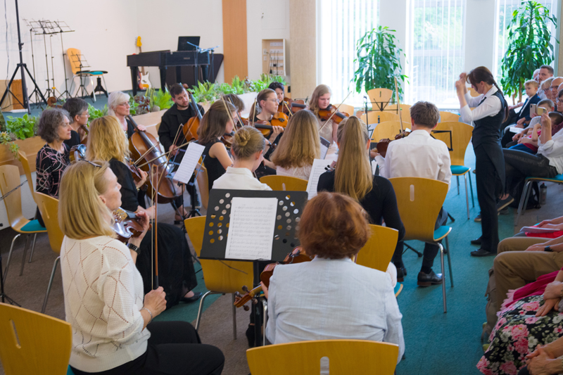 a učitelé ve spojeném orchestru ZUŠ Ježkova, ZUŠ Slunná, Brno a hosté z Brněnské cameraty, sólový klavír výborně zahrál Jan Buchta, student ZUŠ Slunná (žák p. učitelky Jany Nevoralové) v citlivé souhře s orchestrem. Dirigovala p. Kamila Zenklová.