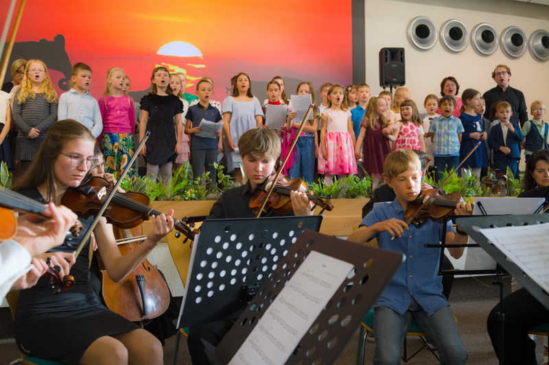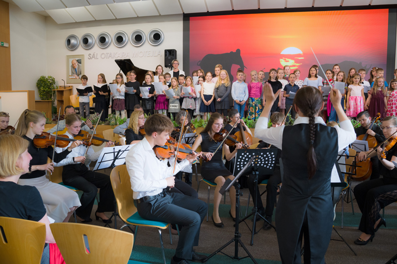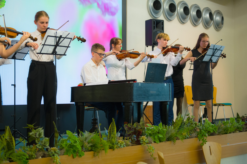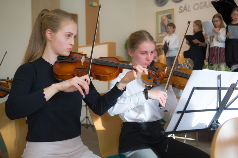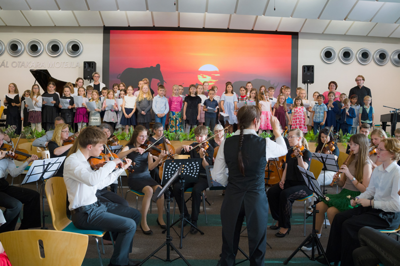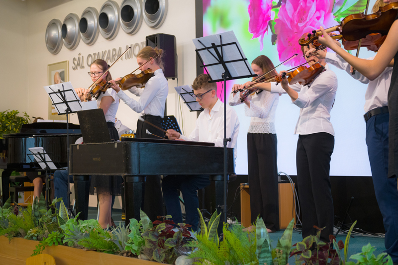 Houslový školní orchestr s cimbálem, violoncellem, příčnou flétnou, klavírem a bas. kytarou vede umělecky p. učitelka Kamila Zenklová, v jejíž úpravě zároveň zazněly uváděné skladby. Byla to lidová píseň Mezi horami a slavná skladba K. Badelta – ústřední melodie z filmu Piráti z Karibiku. V tomto složení hudebních nástrojů hráli: na housle Kristýna Gotfrýdová, Tereza Habancová, Samuel Kytner, Pavlína Preislerová, Kateřina Učňová, Ema Blažková a Kamila Zenklová; violoncello Šárka Mitevová; příčná flétna Julie Jašková; klavír Zuzana Neumannová a Kristýna Kašparová; na cimbál Martin Suchý; bas. kytaru Dalibor B. Hanusek.