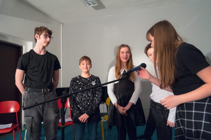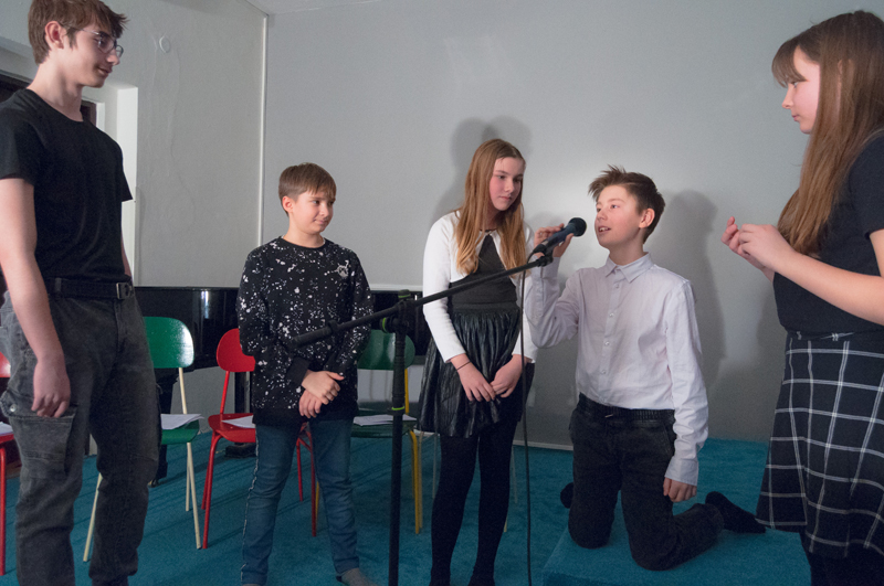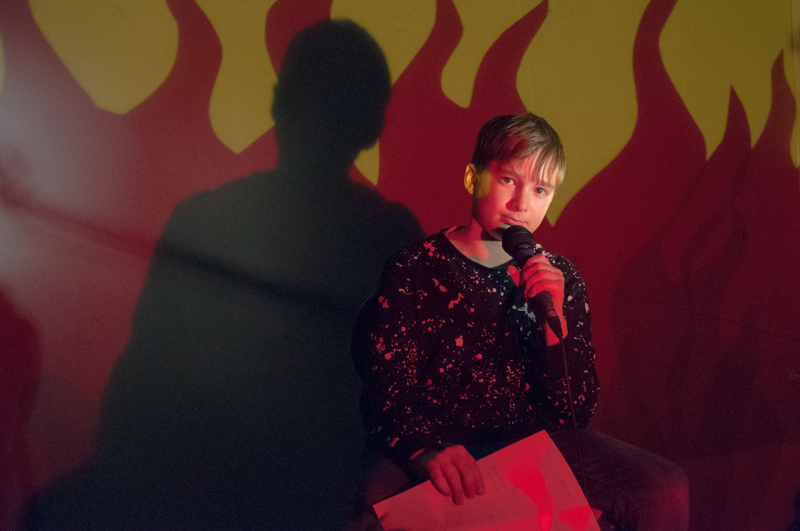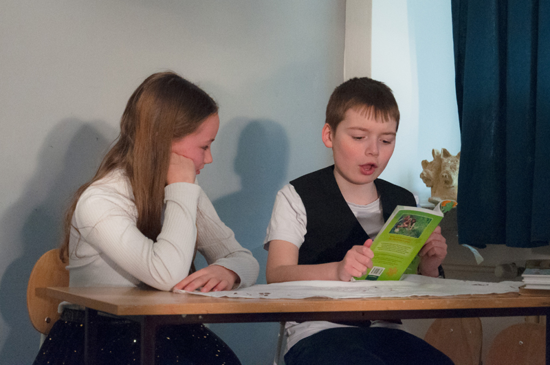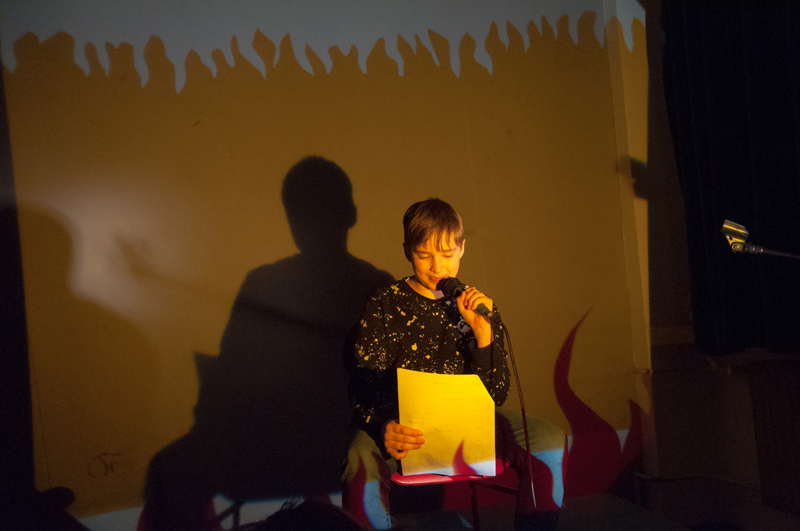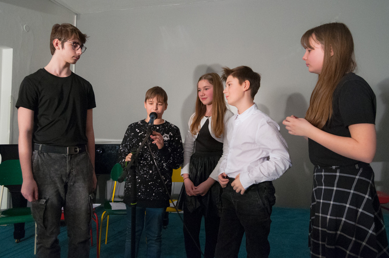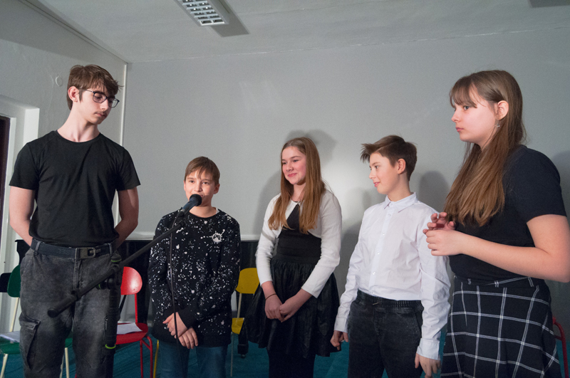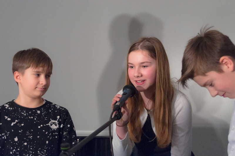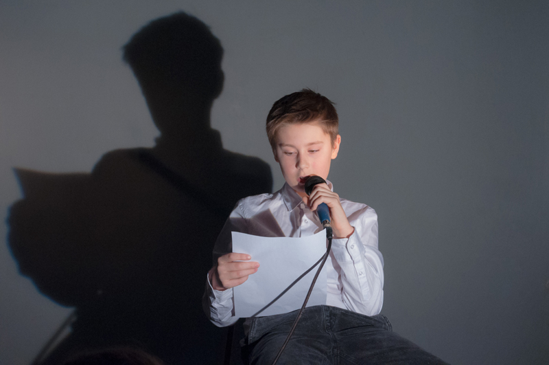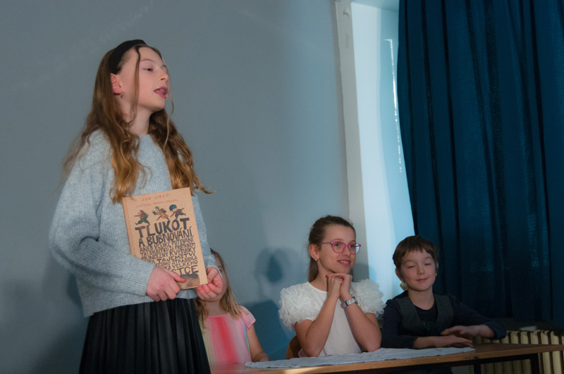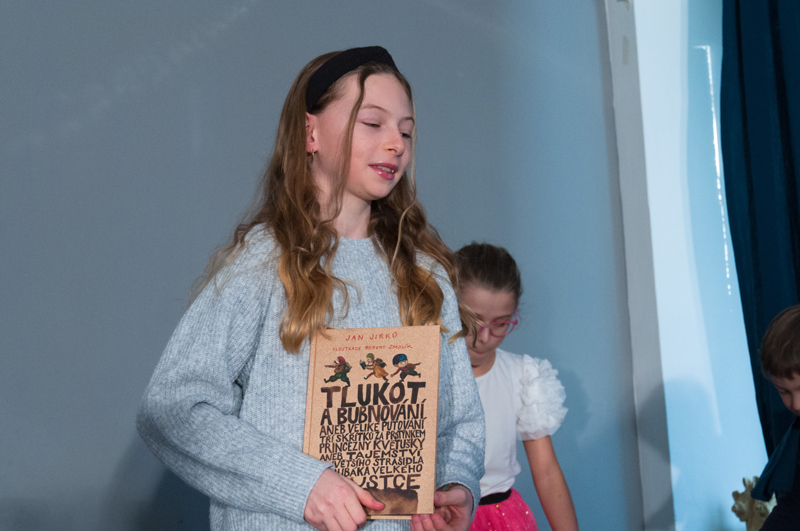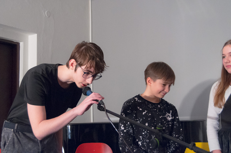 Starší žáci LDO2 překvapili své diváky netradiční ukázkou z výuky v podobě autorského čtení textů. Tvůrčímu psaní a tvorbě příběhů jsme se průběžně věnovali v prvním pololetí, nabyté zkušenosti žáci zúročí i v závěrečném divadelním představení na konci školního roku (kdy se můžete těšit na detektivní příběh z prostředí obchodního domu). Autorské čtení jsme otevřeli příběhem, který všichni žáci společně improvizovali - od diváků získali téma a každý žák vždy navázal jedním slovem. Poté se žáci střídali u mikrofonu