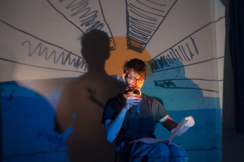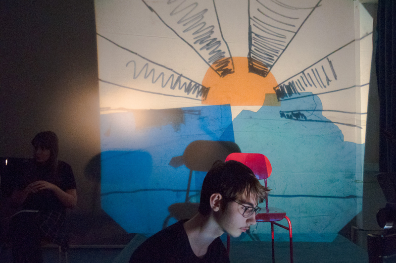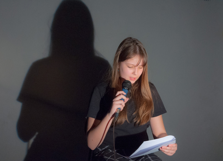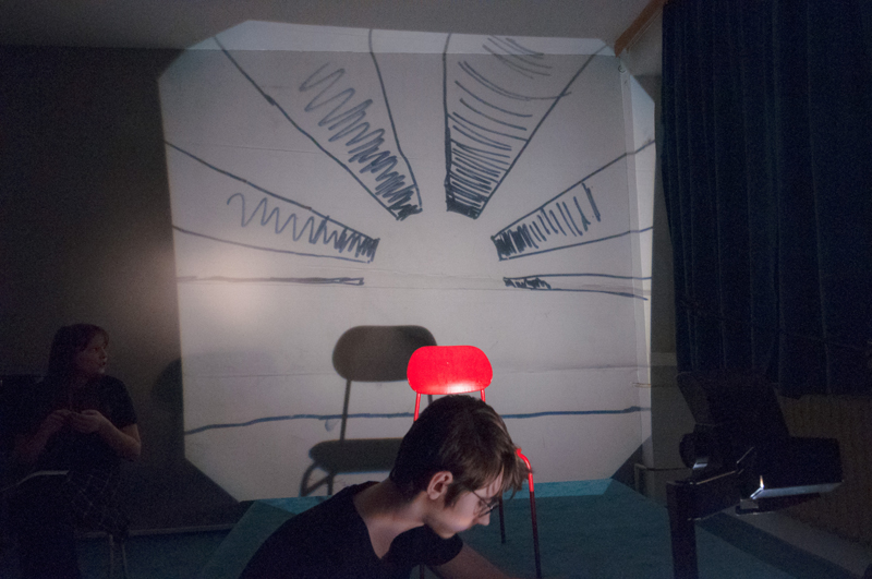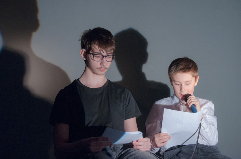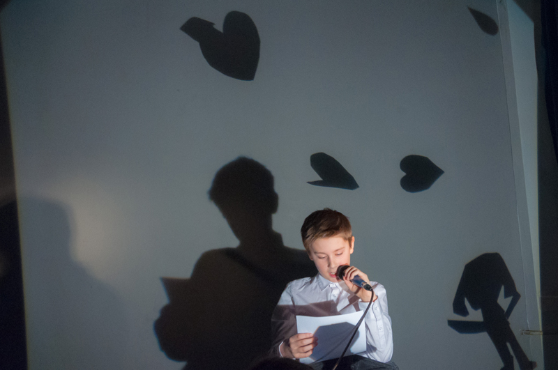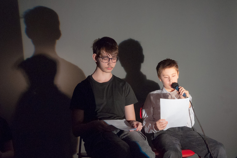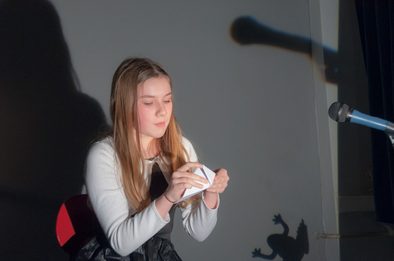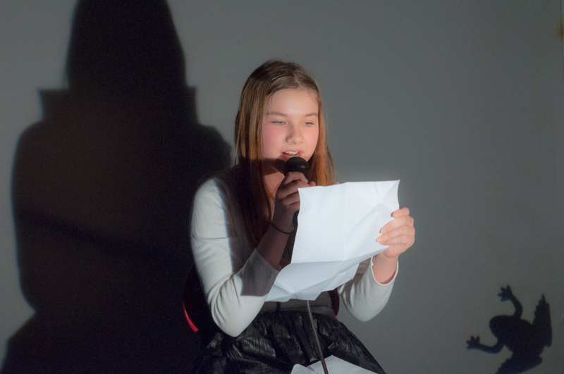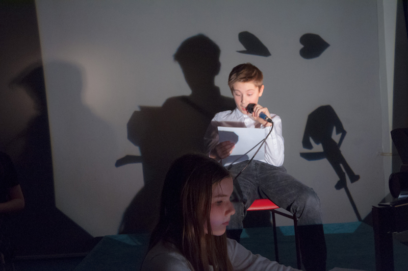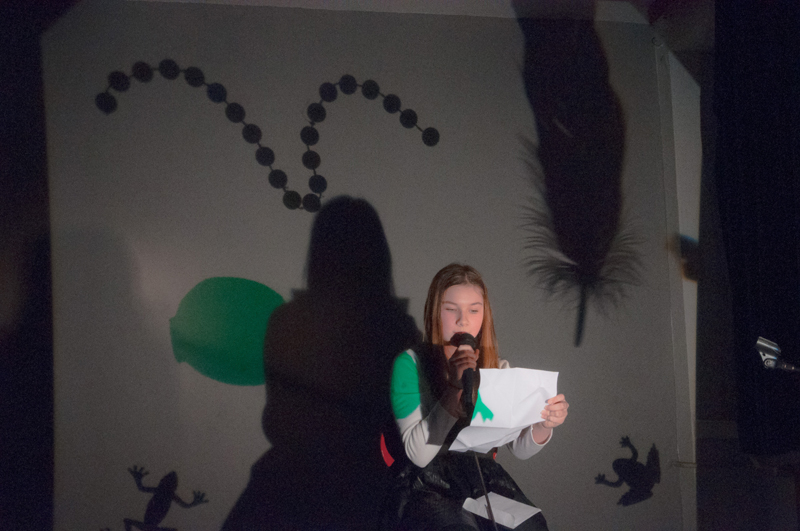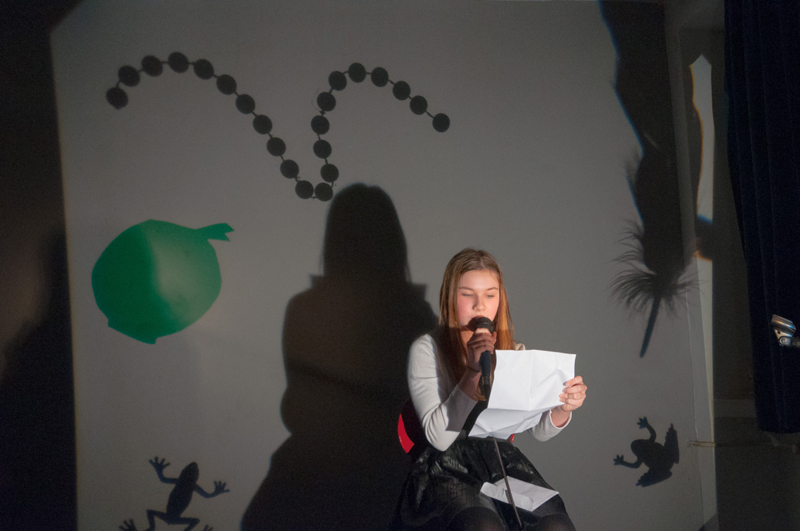 a předčítali texty, které ve výuce vznikly - slyšet byly proudy asociací, krátké příběhy, dopis, japonské haiku a dva dialogy. Žáci si jednotlivé výstupy sami uváděli a doplnili je projekcí stínových obrazů tvořených na meotaru (zpětném projektoru) osvětlujícím místnost. Podařilo se nám tak zprostředkovat divákům komorní poetický zážitek. Celý autorský večer jsme uzavřeli opět společným příběhem, tentokrát měl každý žák možnost přidat celou větu. Diváci nás svým smíchem a potleskem přesvědčili k přídavku a skupina LDO2 ve složení Jiří Čihák, Eliška Žáková, Ester Kunderová, Lukáš Kučera a Michal Kratochvil tak zažila úspěch