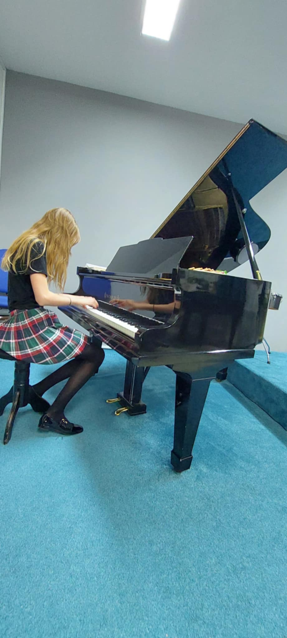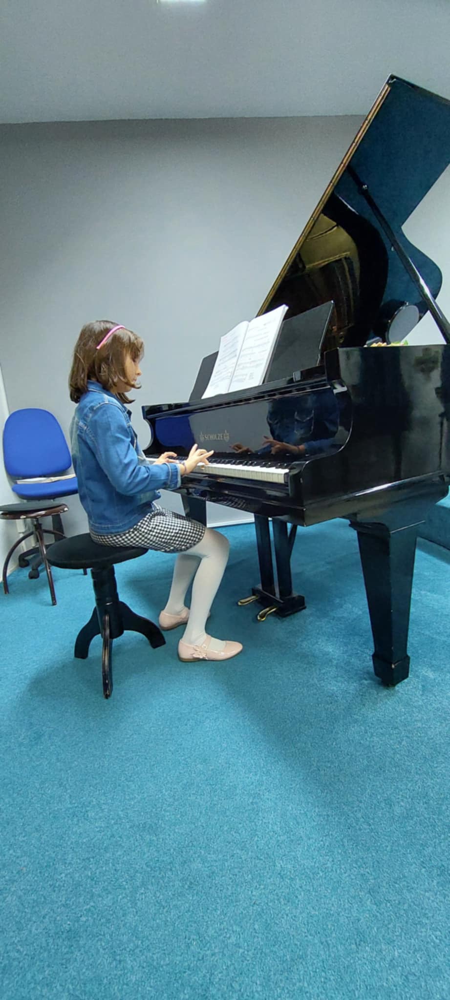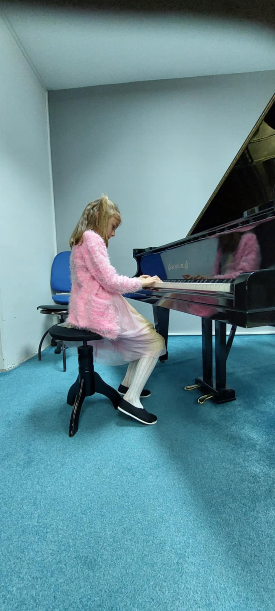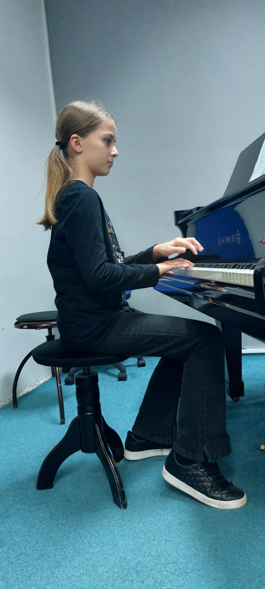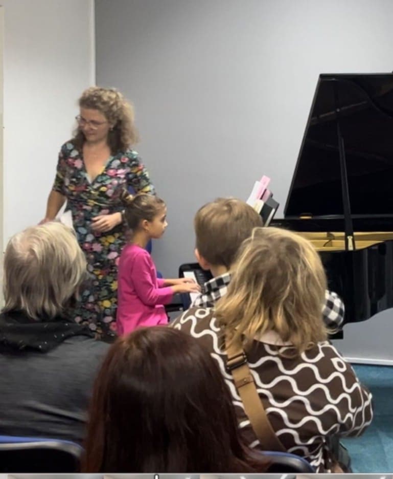 Štěpánka Fojtová (1. ročník) perfektně zvládla hru s pedálem v skladbě Morning Prelude od J. Bastiena.