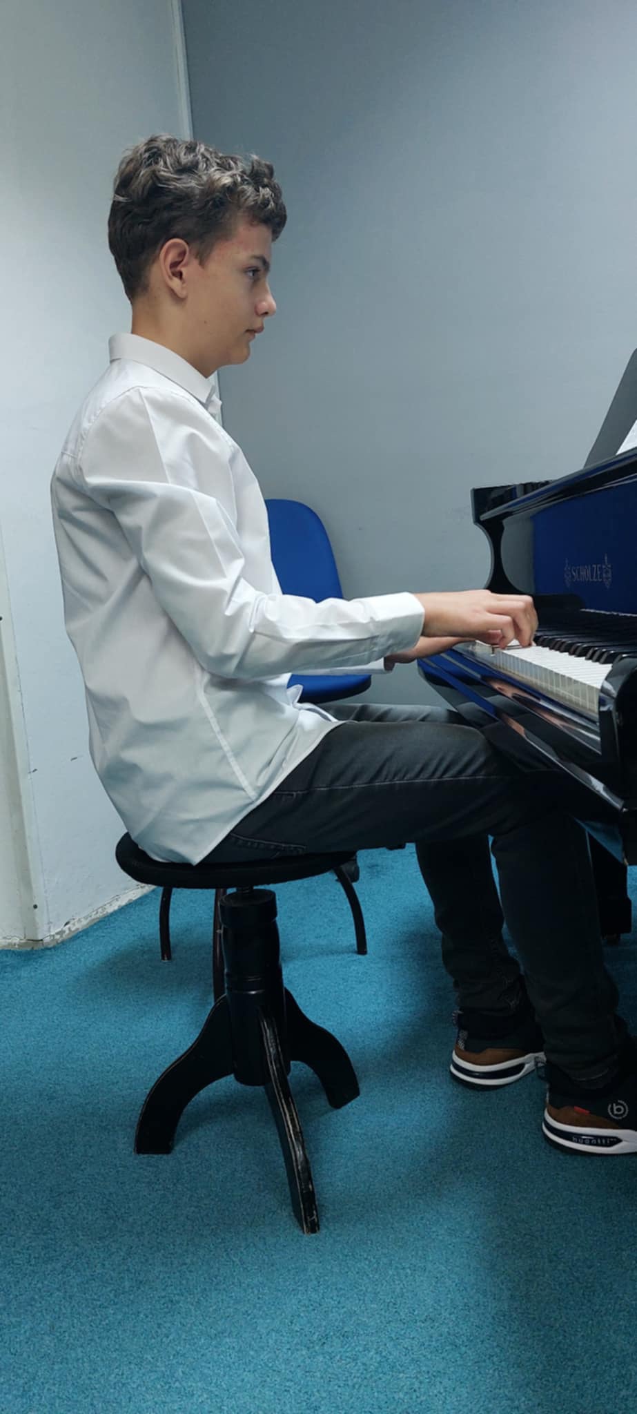 Karel Šmíd z čtvrtého ročníku zakončil celý hudební podvečer skladbou s názvem Etuda (H.Lemoine) a soustředěnou interpretací skladby B. Martinů Kolombína tančí.