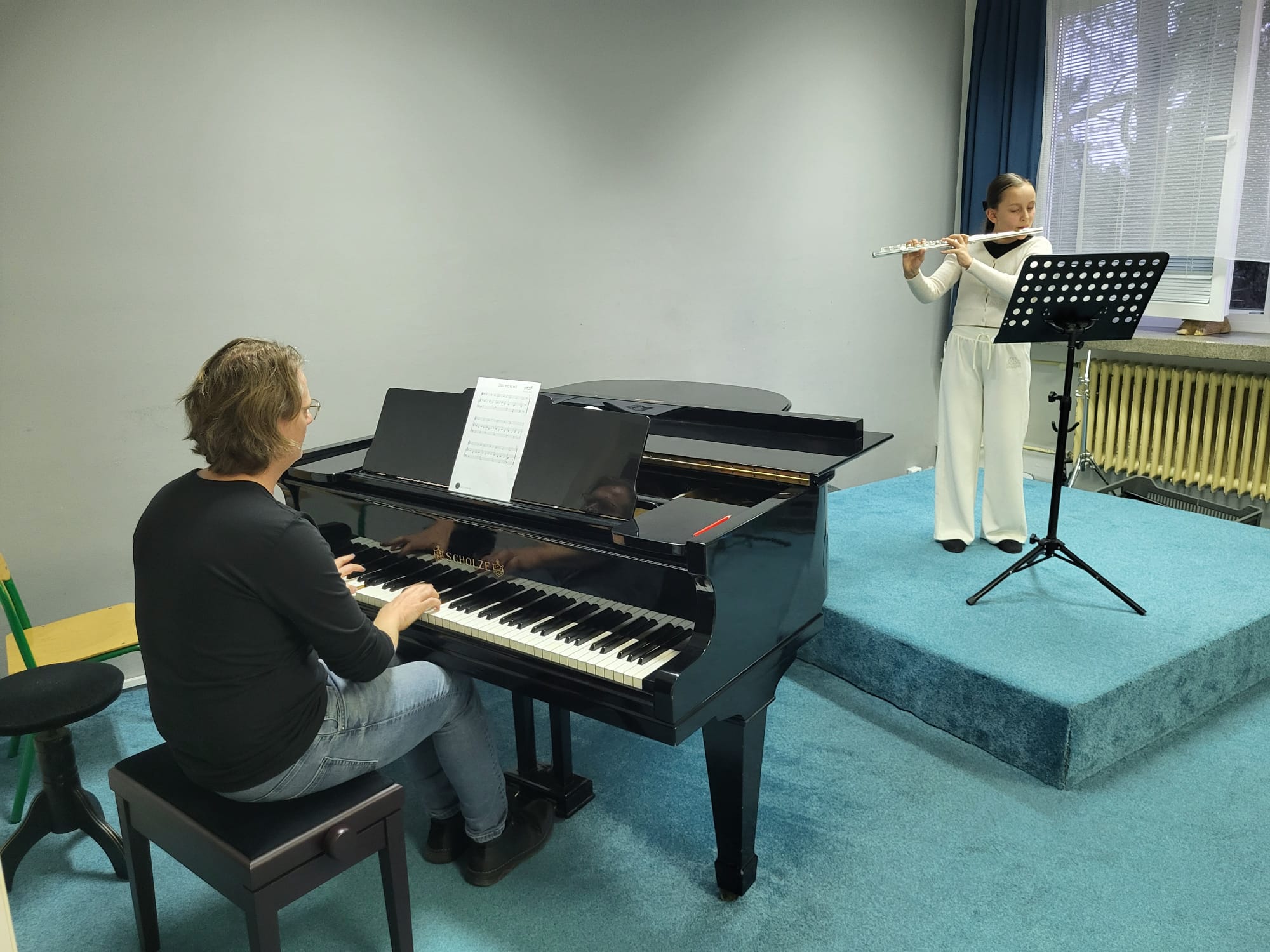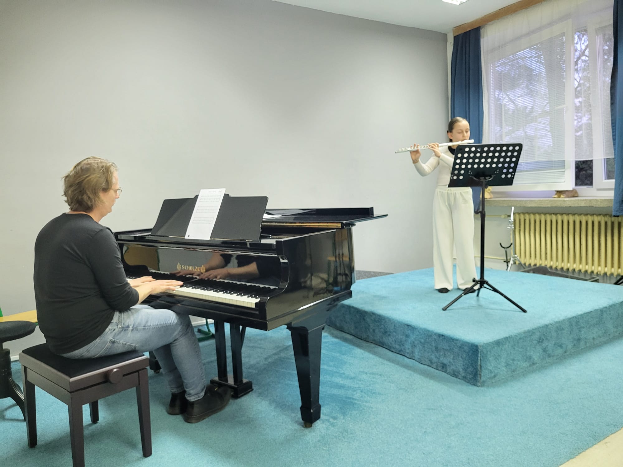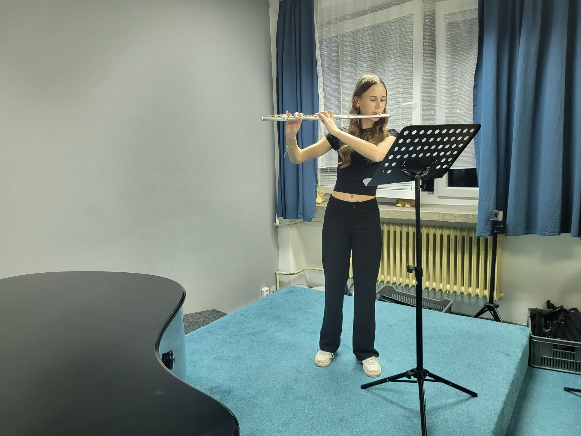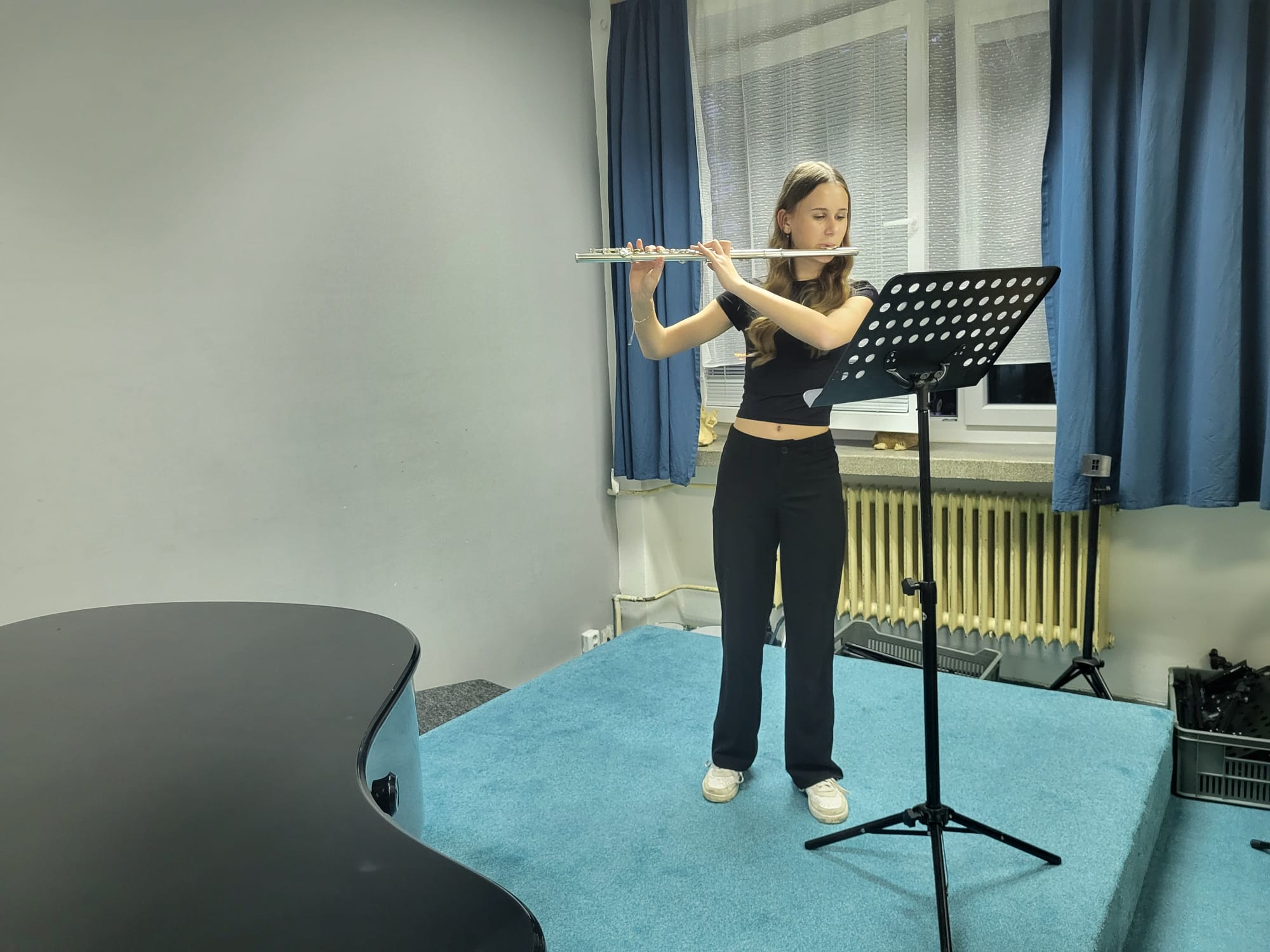 Kristýna Kašparová (1. r., hra na příčnou flétnu, žákyně p. učitelky Natálie Železníkové) hrála skladbu P. Harrise Scapino.