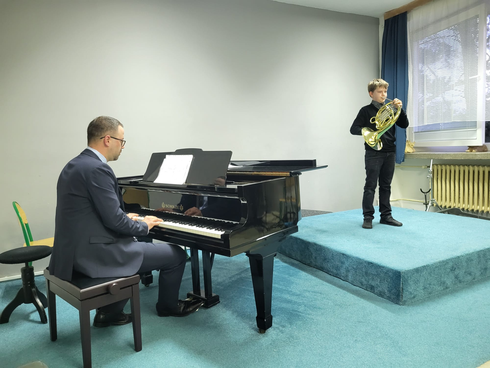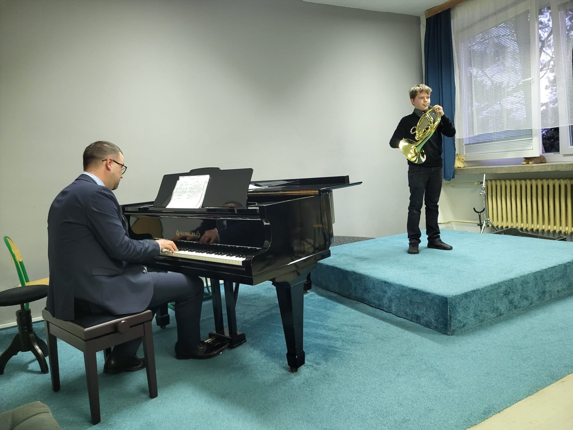 Triovou sonátu F dur J. Ch. Pepusche hráli ve flétnovém duu Lucie Oleksíková (1. r. II. st., hra na zob. flétnu, žákyně p. učitele Petra Zapletala) se svým p. učitelem P. Zapletalem, který hrál na tenorovou zob. flétnu. Na klavír duo doprovodil p. Marek Paľa.