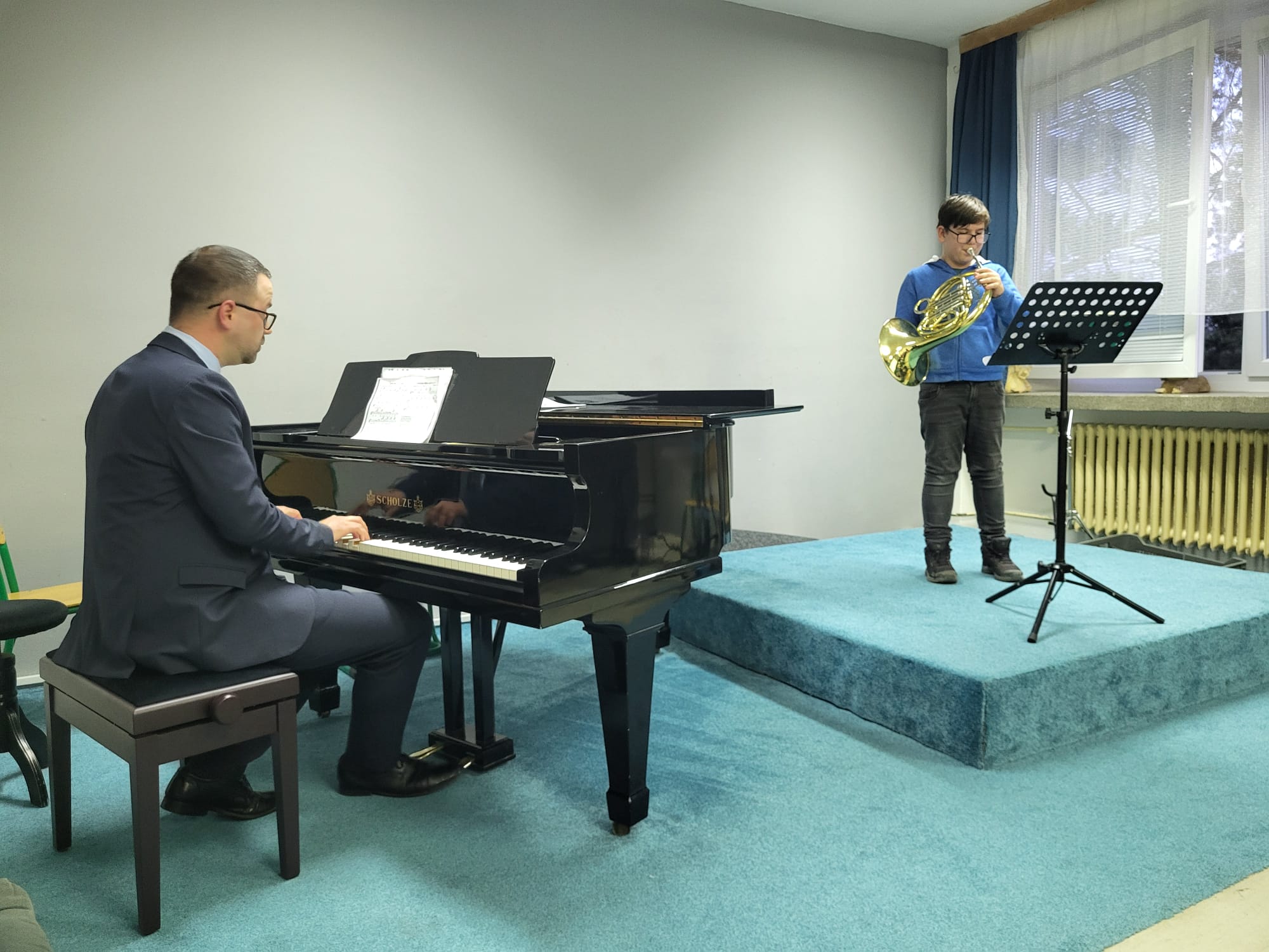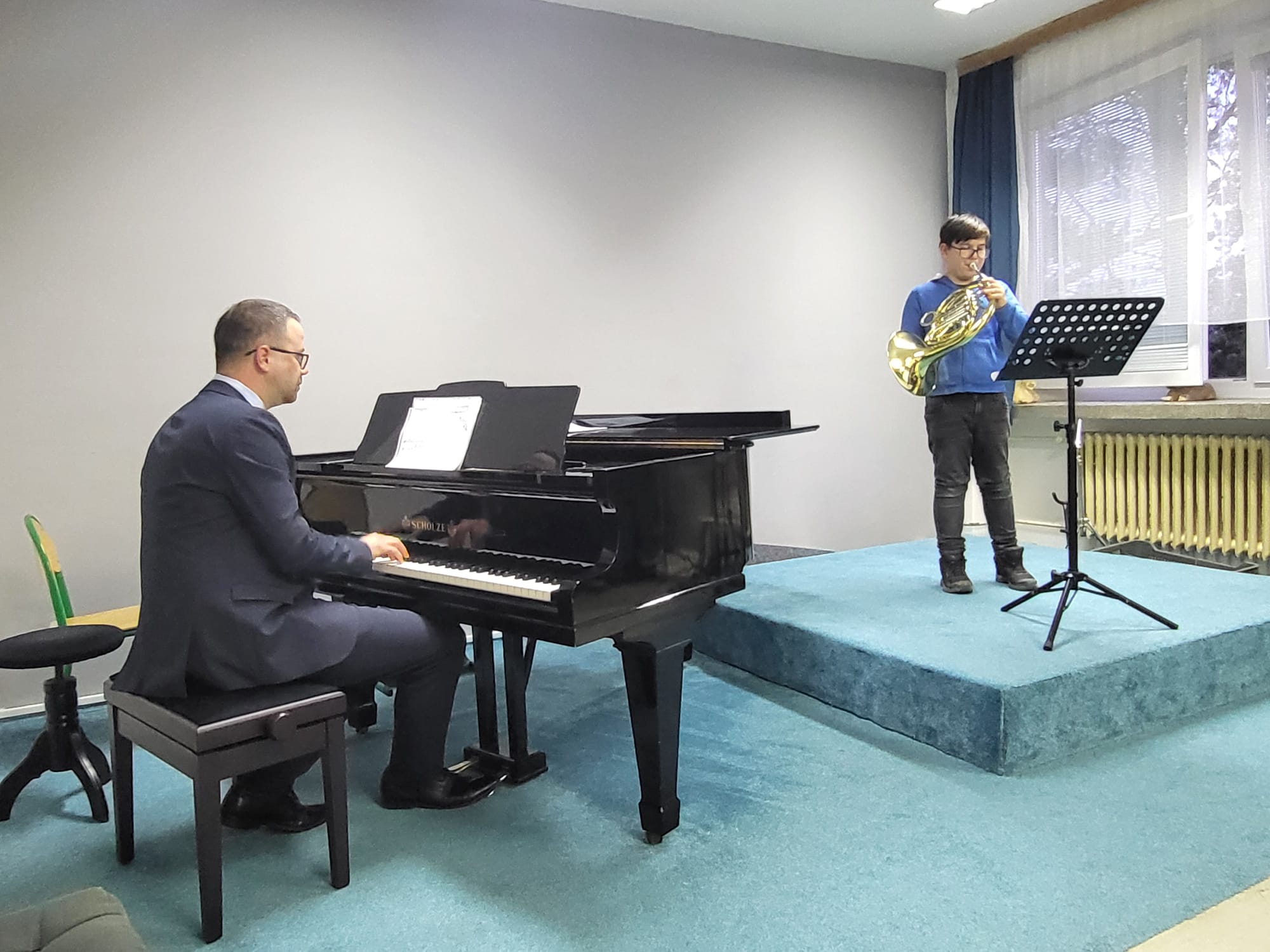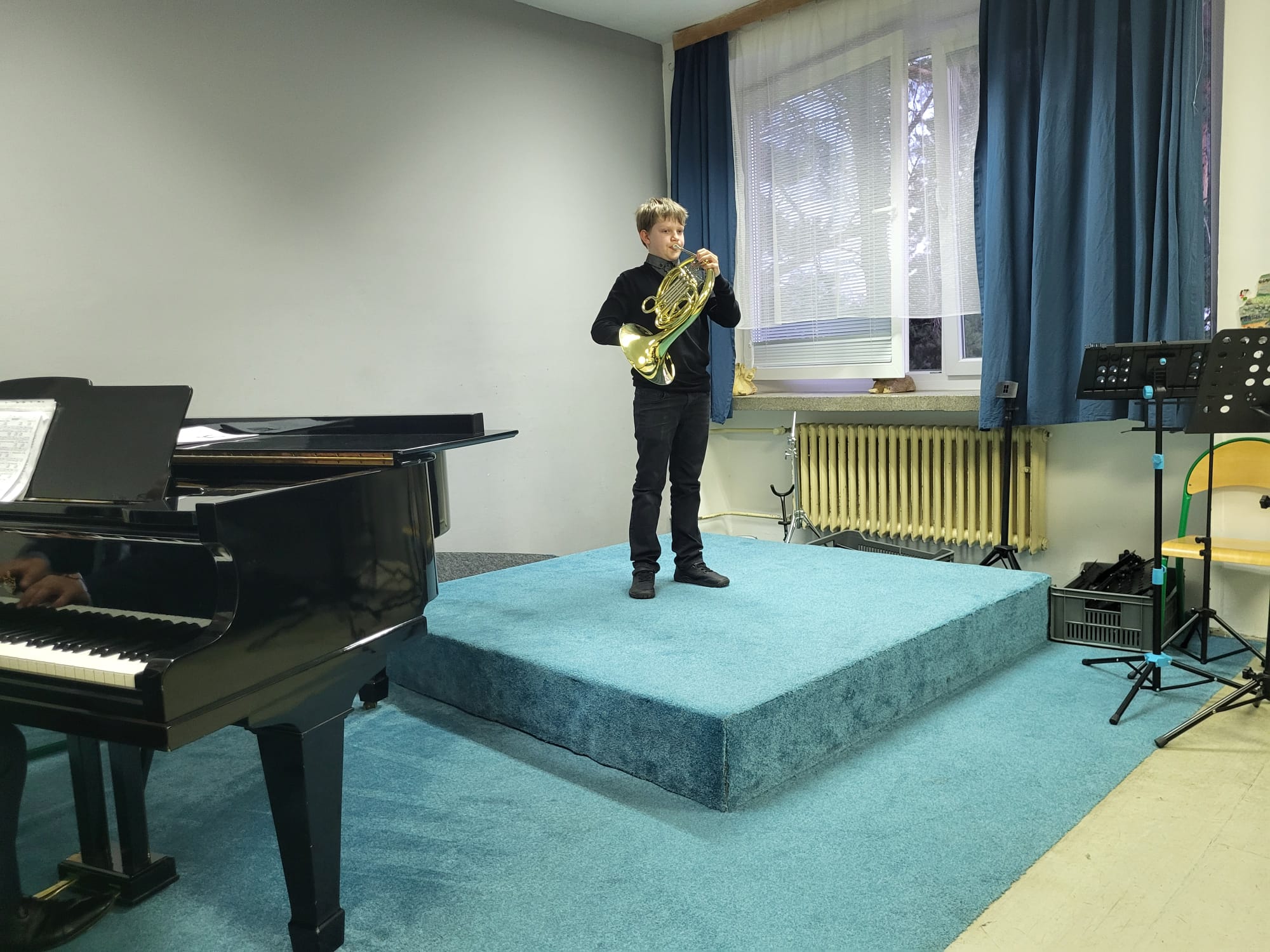Albert Blažek (1. r., hra na lesní roh, žák p. učitele Tomáše Němce) hrál melodii americké lidové písně Buráky.