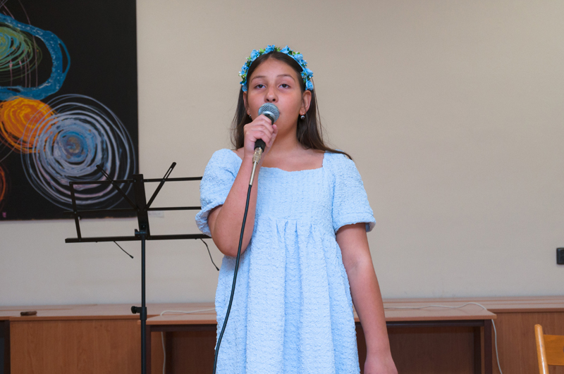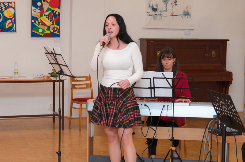 Svým jemně a jasně zvučným hlasem zazpívala song chudé dívky Zámek v oblacích C. M. Schönberga z muzikálu Bídníci Eliška Vavříková (3. r., sólový zpěv), žákyně p. učitelky Moniky Vávrové Filové.