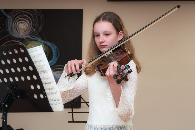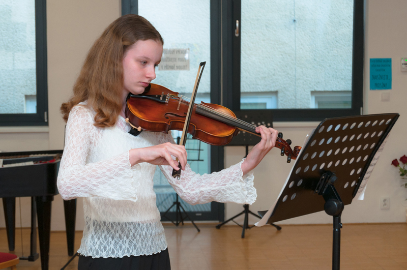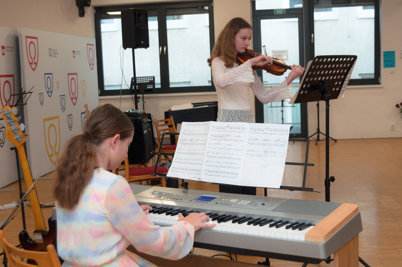 Něžnou melodii Guillauma Yann Tiersena z filmu Amelie z Montmartru přednesly v souhře houslí s klavírem Simona Neumannová (5. r., klavír) a Tereza Habancová (4. r., housle). Dívky jsou žákyně p. učitelky Kamily Zenklové.