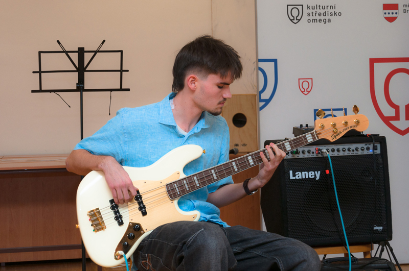 Hrou na basovou kytaru se představil Lukáš Buček (3. r. II. st., el. kytara), který na hudebním oboru naší ZUŠ hraje také výborně na zobcové flétny především klasickou hudební produkci. Dnes večer na svou bas. kytaru hrál v souhře s el. kytarou p. Dalibora B. Hanuska Chicago Blues B. B. Kinga a Bahia Funk Lee Ritenour.