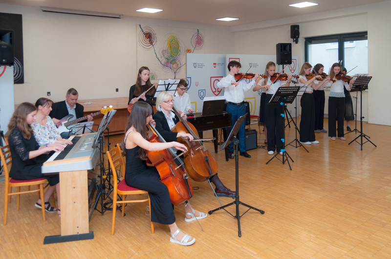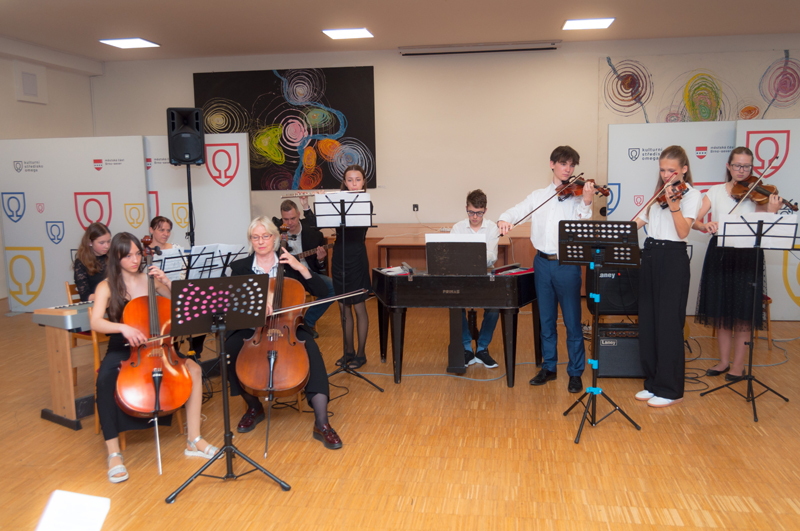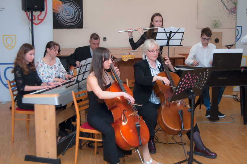 Originální nastudování hry školního orchestru písně Toreadora z opery G. Bizeta Carmen, lidové písně Mezi horami a ústřední melodie Klause Badelta z filmu Piráti z Karibiku ve své hudební úpravě připravila se studenty p. učitelka Kamila Zenklová. Účinkovaly houslistky Anna Dvořáková, Kristýna Gotfrýdová, Tereza Habancová, Pavlína Preislerová, Kateřina Učňová, Ema Blažková, houslista Samuel Kytner, na violoncello hrála Zuzana Budínová (společně se svou p. učitelkou hry na violoncello Šárkou Mitevovou), na příčnou flétnu hrála Julie Jašková a na klavír Zuzana Neumannová, Simona Neumannová a Kristýna Kašparová, cimbál rozezvučel v doprovodech i v sólové hře Martin Suchý a na basovou kytaru orchestr