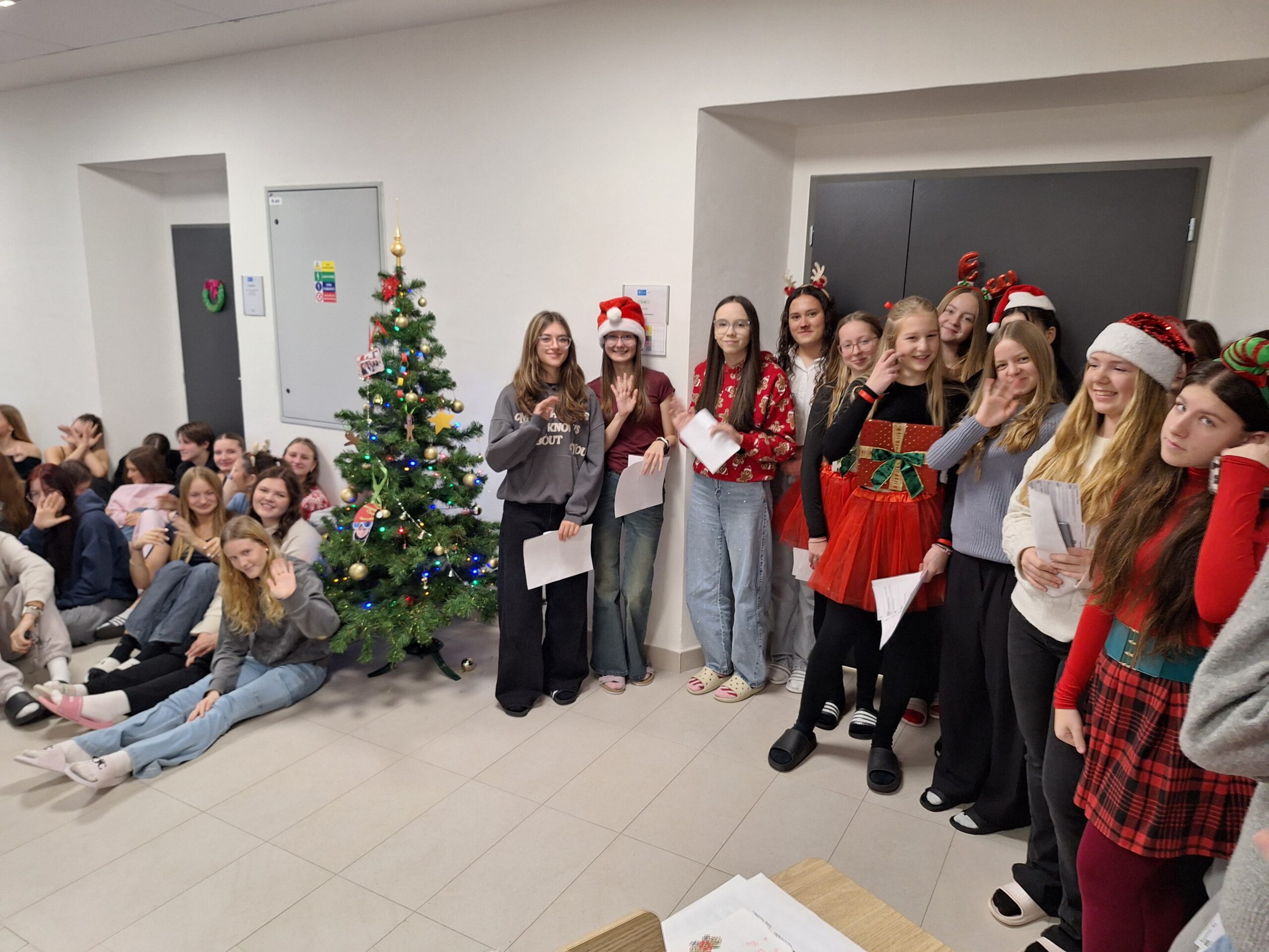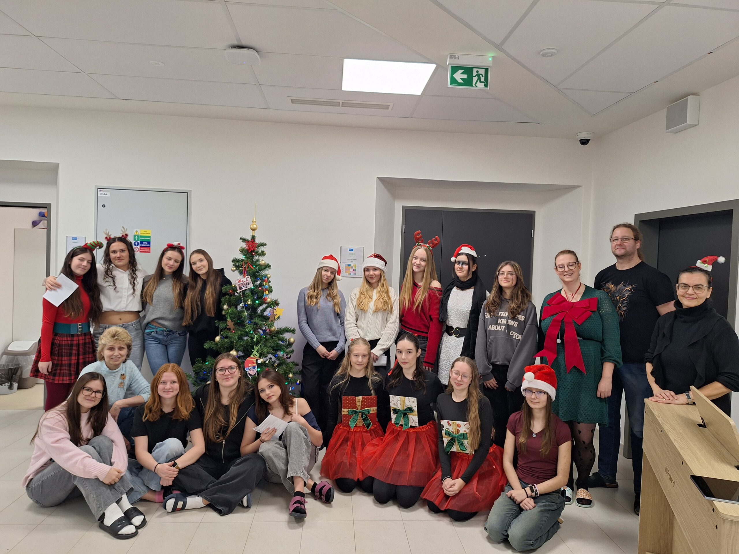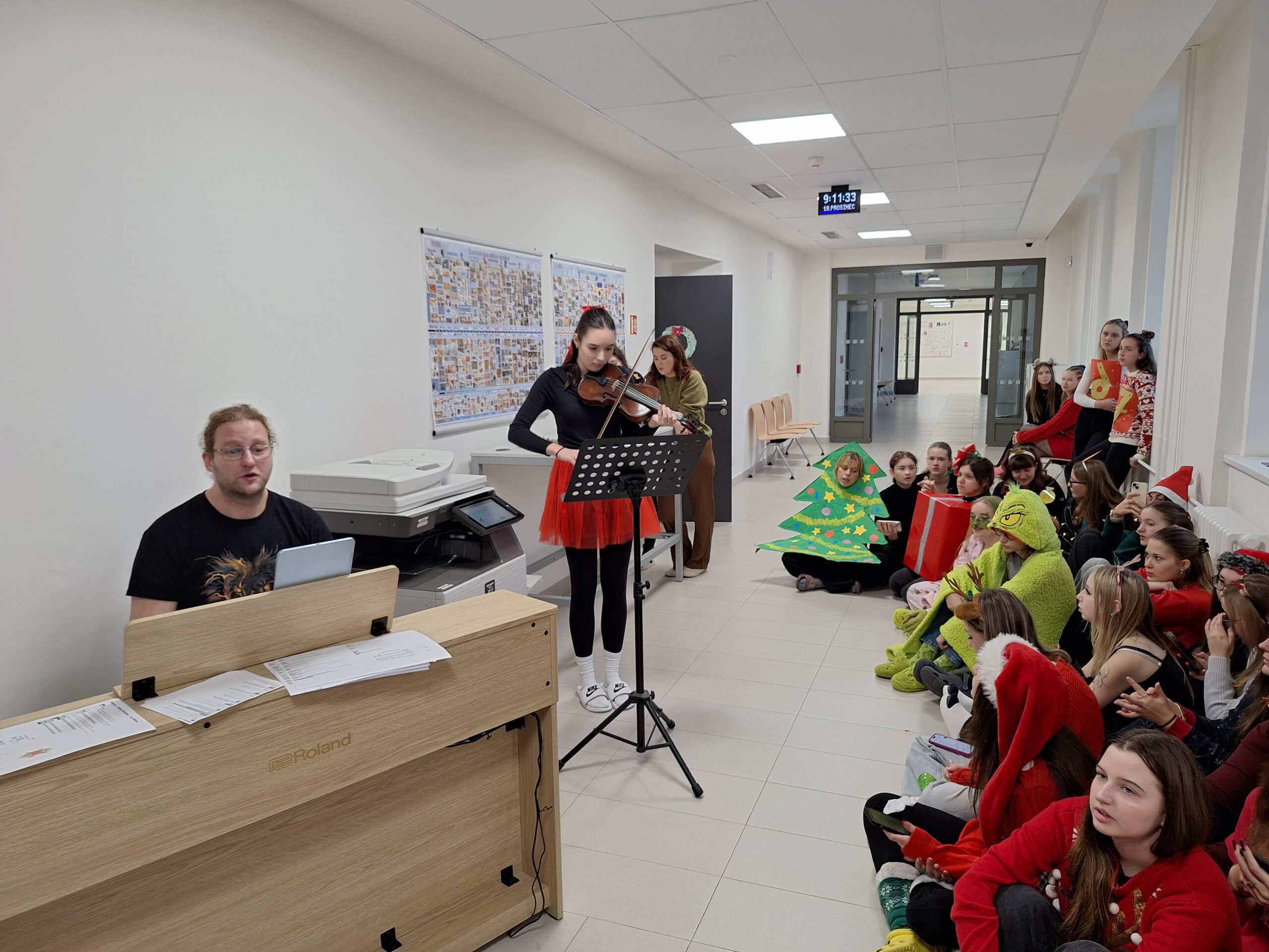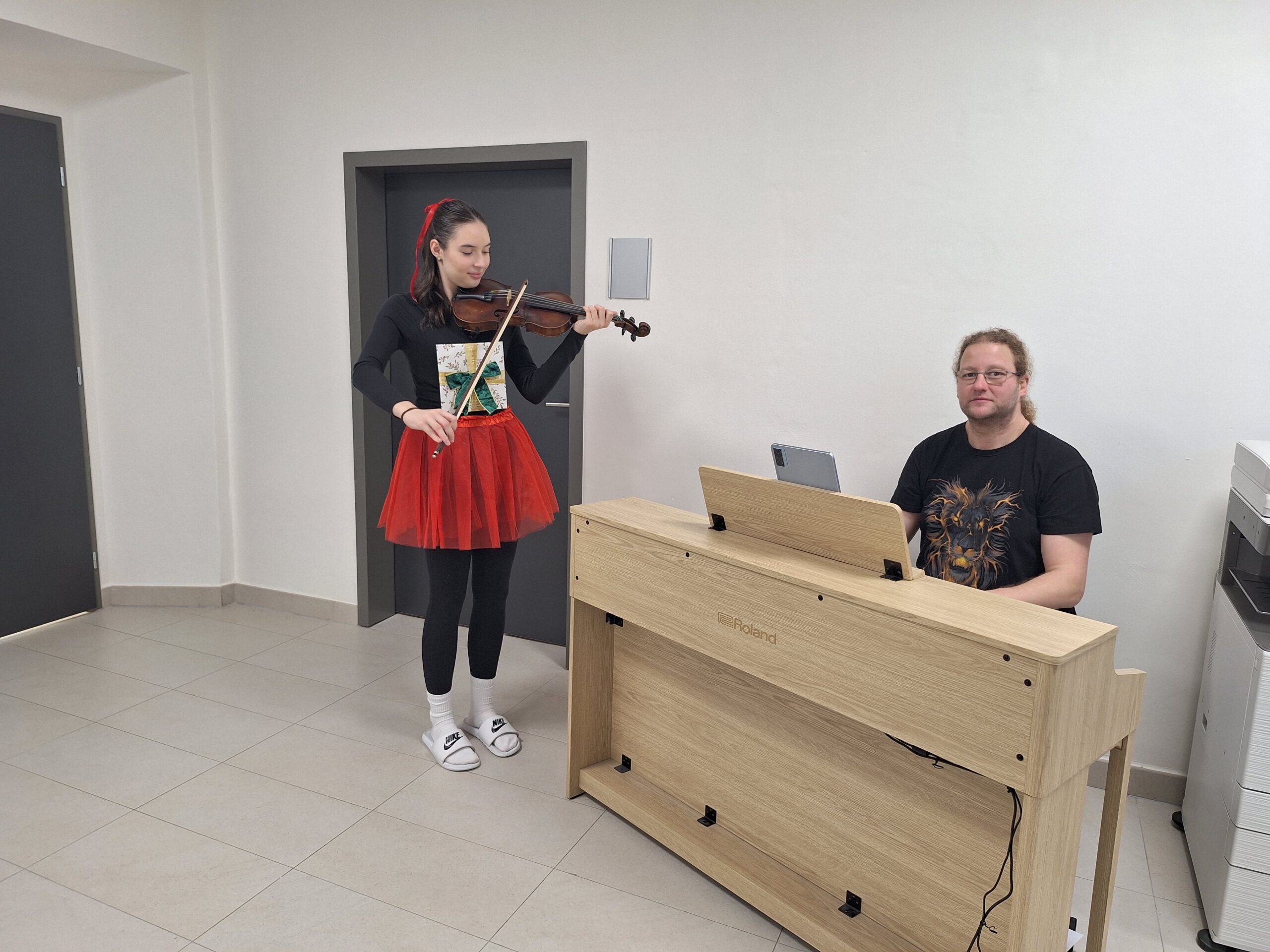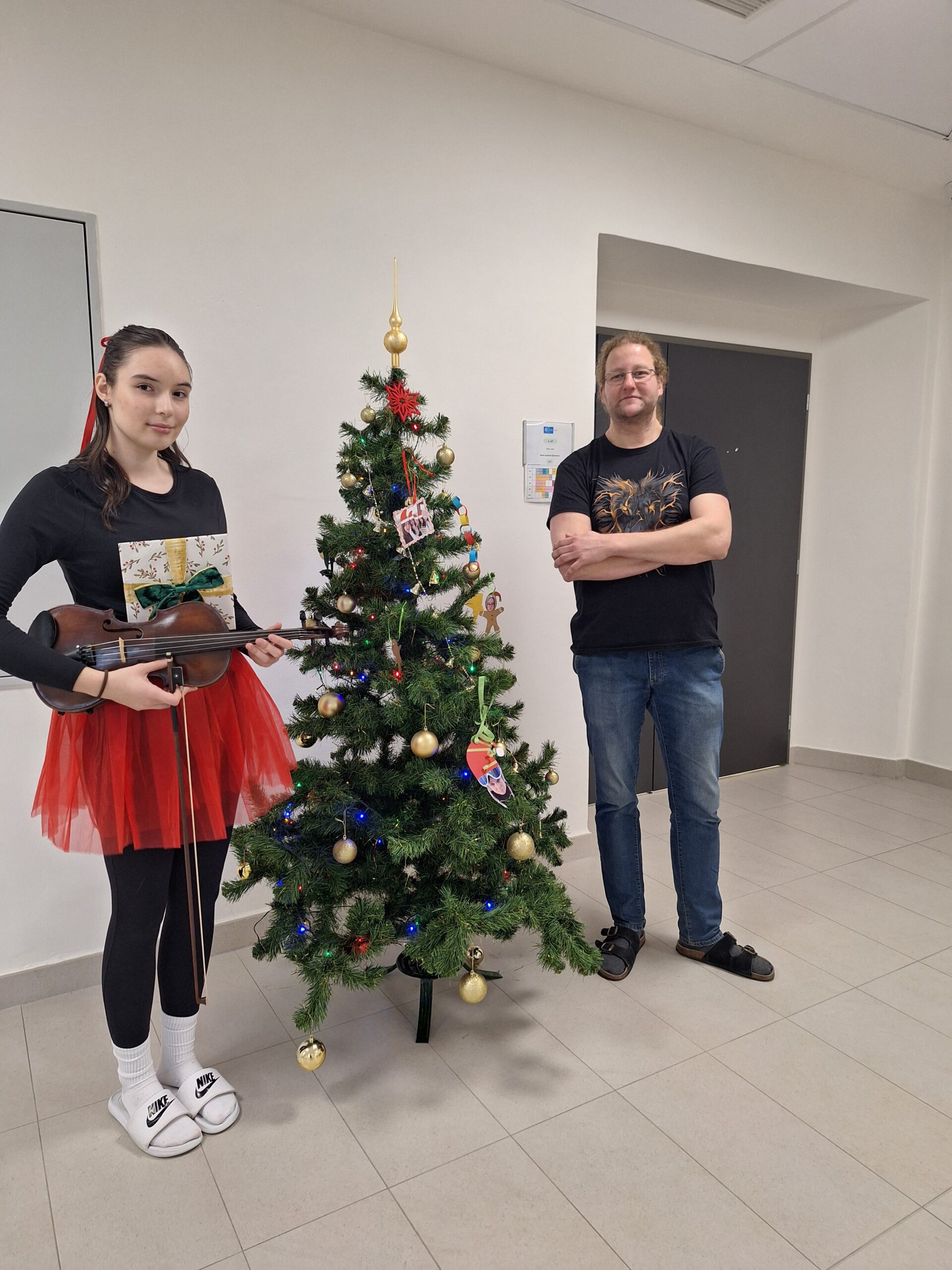 O pestrý program se postarala třída 1. AP, na housle hrála Barunka Krčková a na klavír doprovázel pan učitel Jakub Tvrzník. Všichni se tak svým zpěv a hrou podíleli na vytvoření příjemné předvánoční atmosféry, kterou jsme si společně užili.