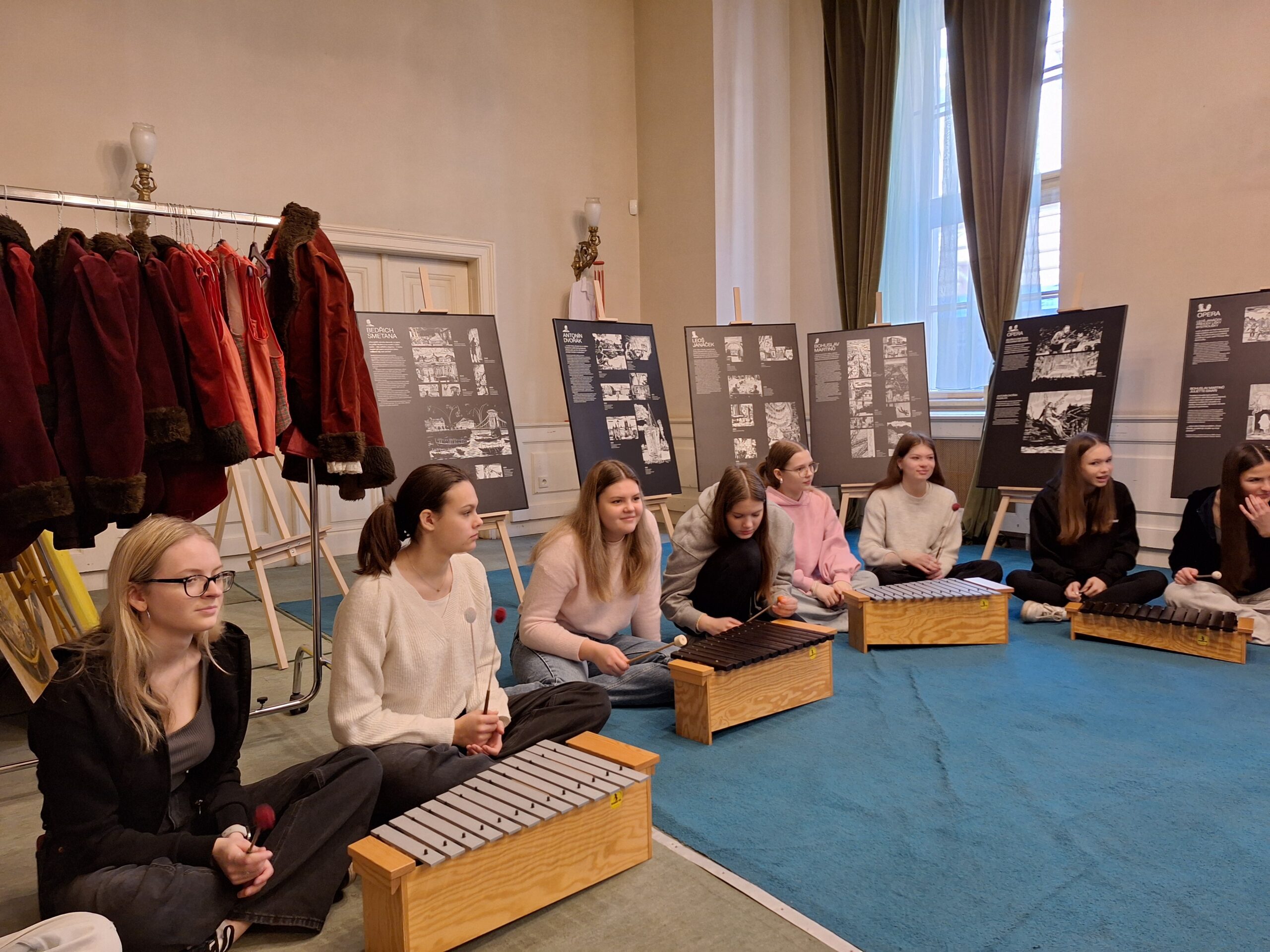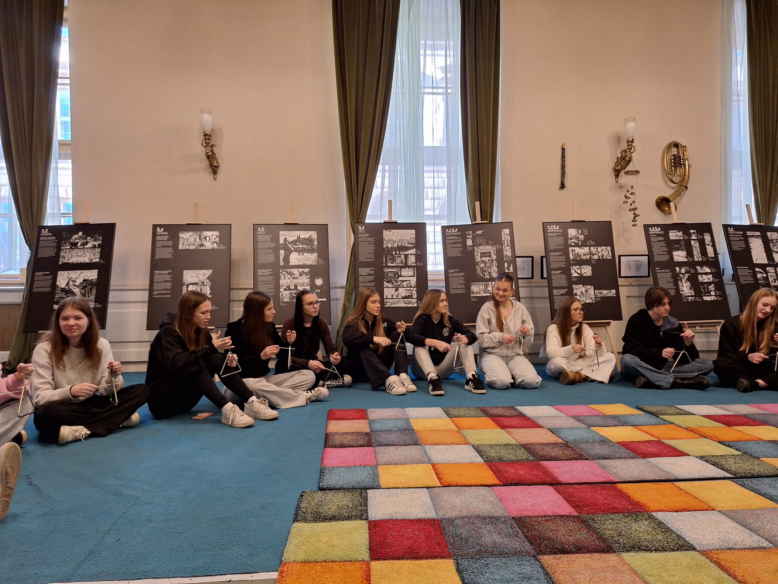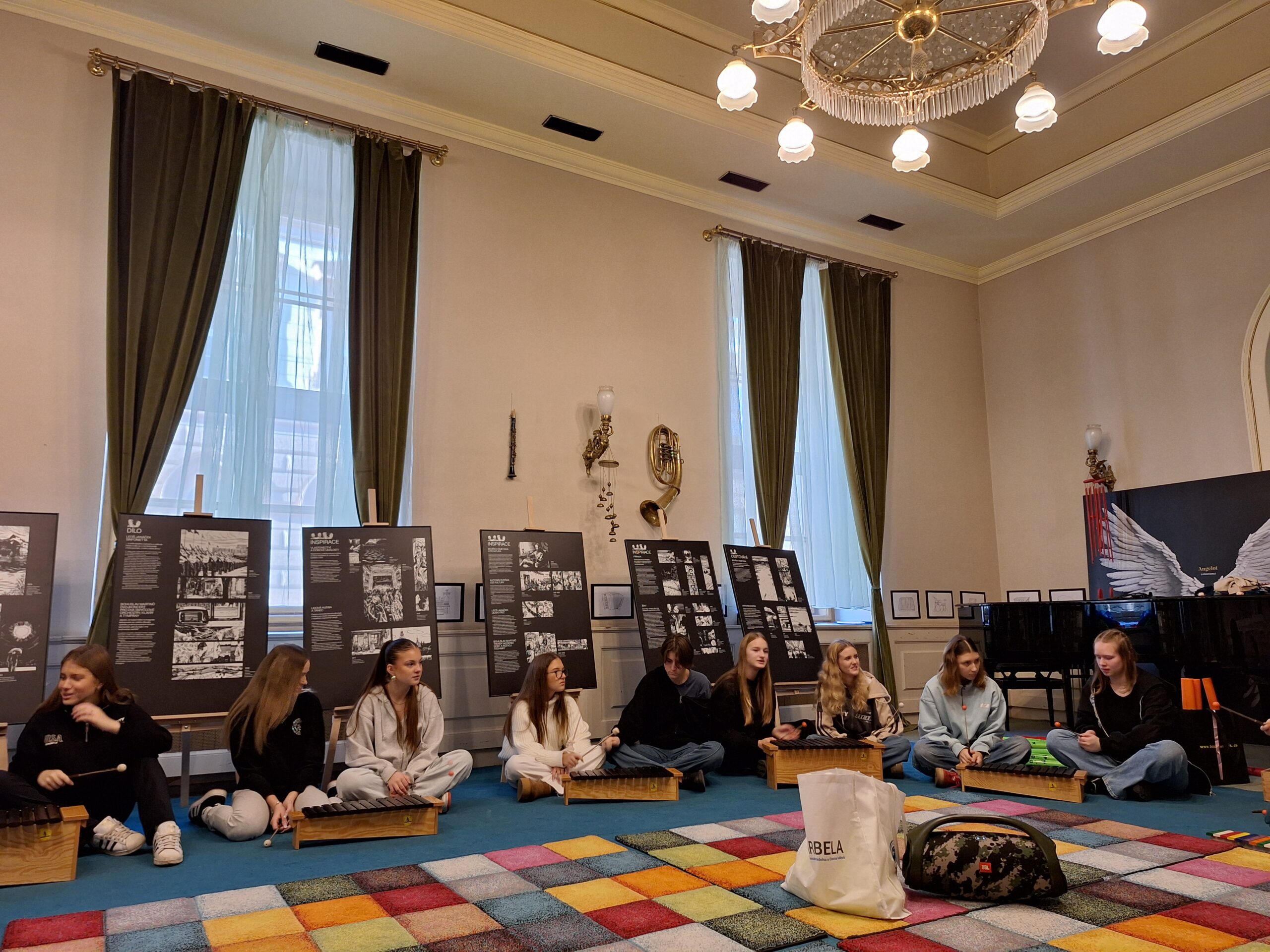 Do rytmu skladby jsme buď míček vyhazovaly, nebo s ním driblovaly o zem a k tomu stíhaly tleskat. Hlavní náplní programu však byla hra na Orffovy nástroje. Vyzkoušely jsme si plno zajímavých nápadů, jak nástroje využít při doprovodu k hudebním ukázkám. Nejvíce nás zaujala hra na triangly a tamburíny na hudbu z baletu Louskáček a práce s boomwhackery k soundtracku z filmu The Addams Family. Na závěr jsme potichu a po špičkách vklouzly do sálu, kde probíhala zkouška smyčcových a dechových nástrojů, kterou vedl šéfdirigent Filharmonie Brno Dennis Russell Davies.