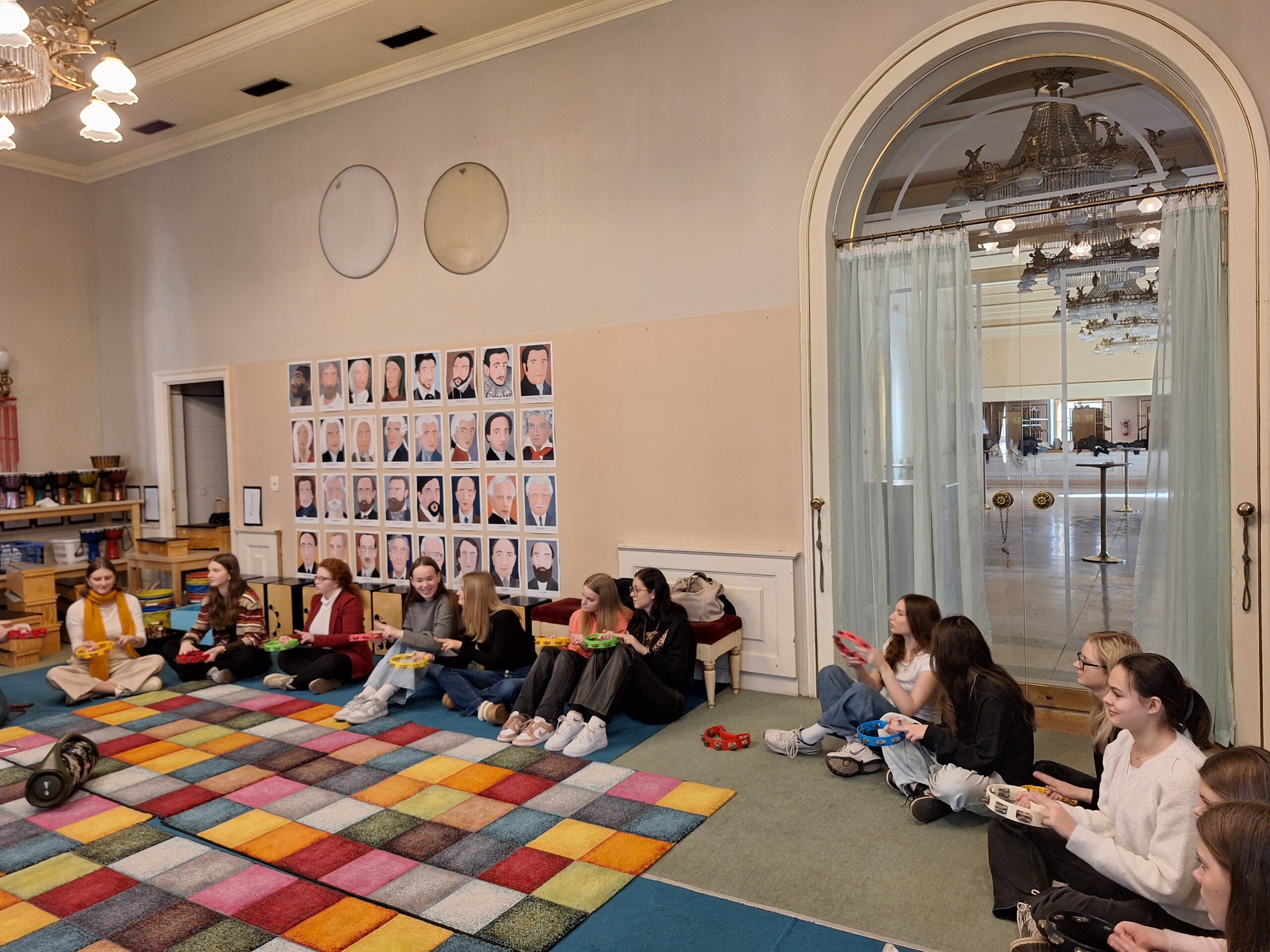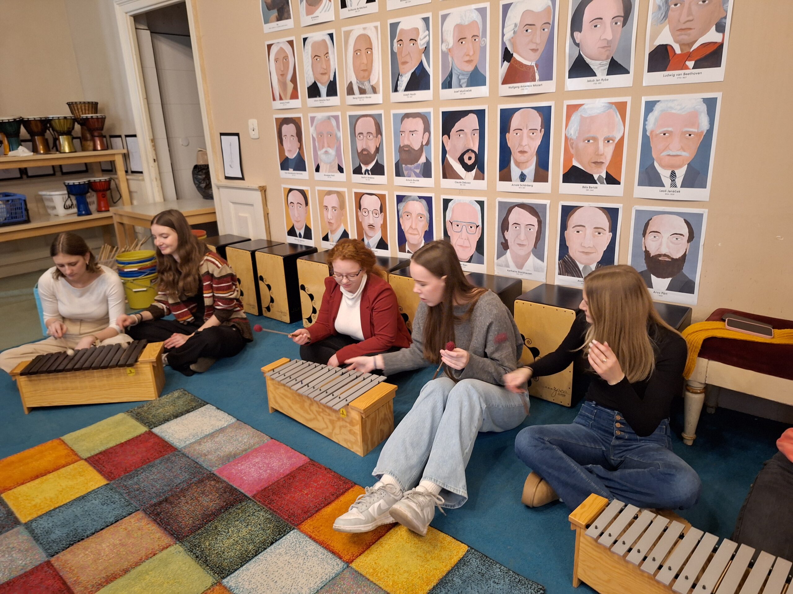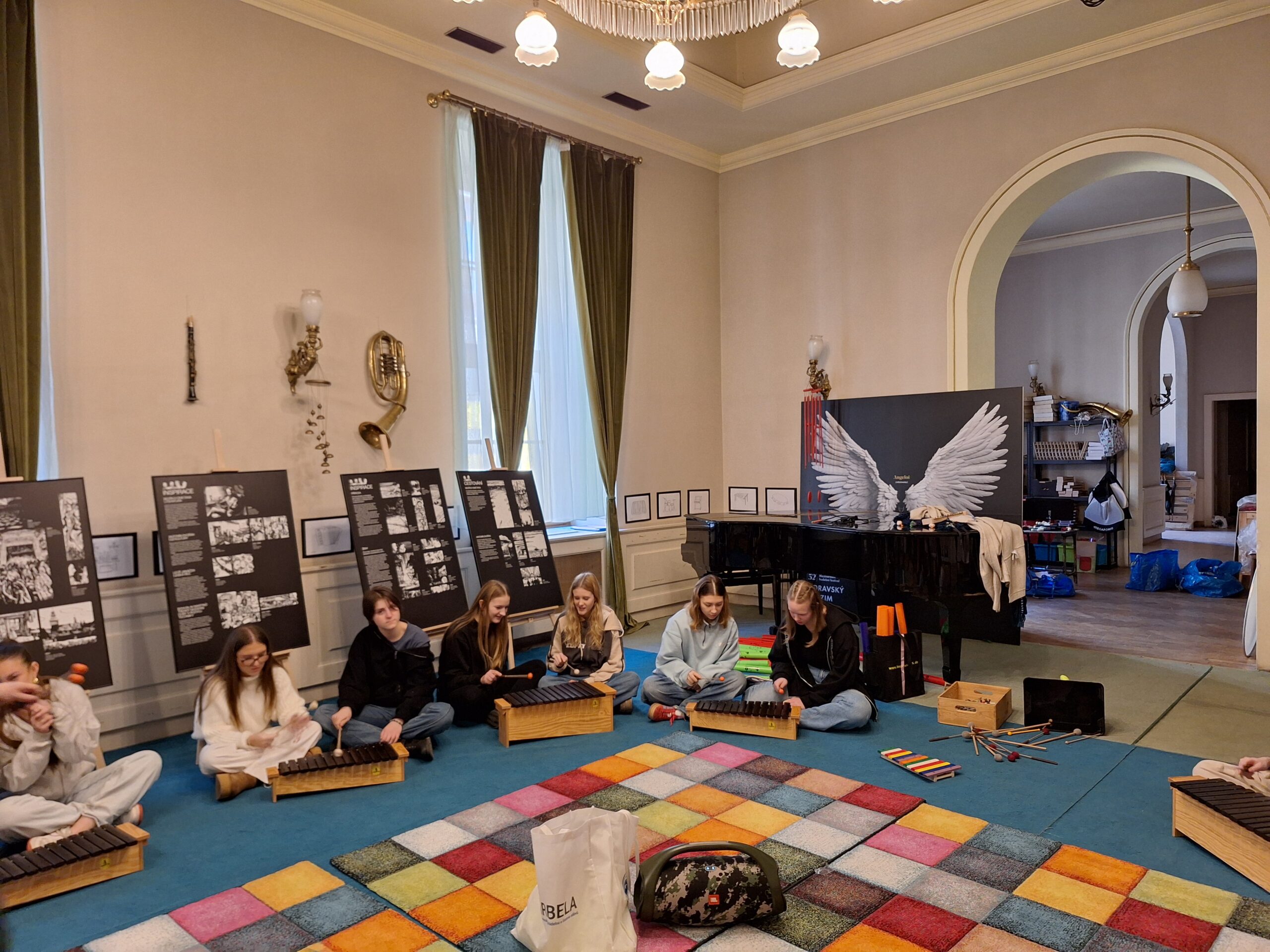 Do rytmu skladby jsme buď míček vyhazovaly, nebo s ním driblovaly o zem a k tomu stíhaly tleskat. Hlavní náplní programu však byla hra na Orffovy nástroje. Vyzkoušely jsme si plno zajímavých nápadů, jak nástroje využít při doprovodu k hudebním ukázkám. Nejvíce nás zaujala hra na triangly a tamburíny na hudbu z baletu Louskáček a práce s boomwhackery k soundtracku z filmu The Addams Family. Na závěr jsme potichu a po špičkách vklouzly do sálu, kde probíhala zkouška smyčcových a dechových nástrojů, kterou vedl šéfdirigent Filharmonie Brno Dennis Russell Davies.
