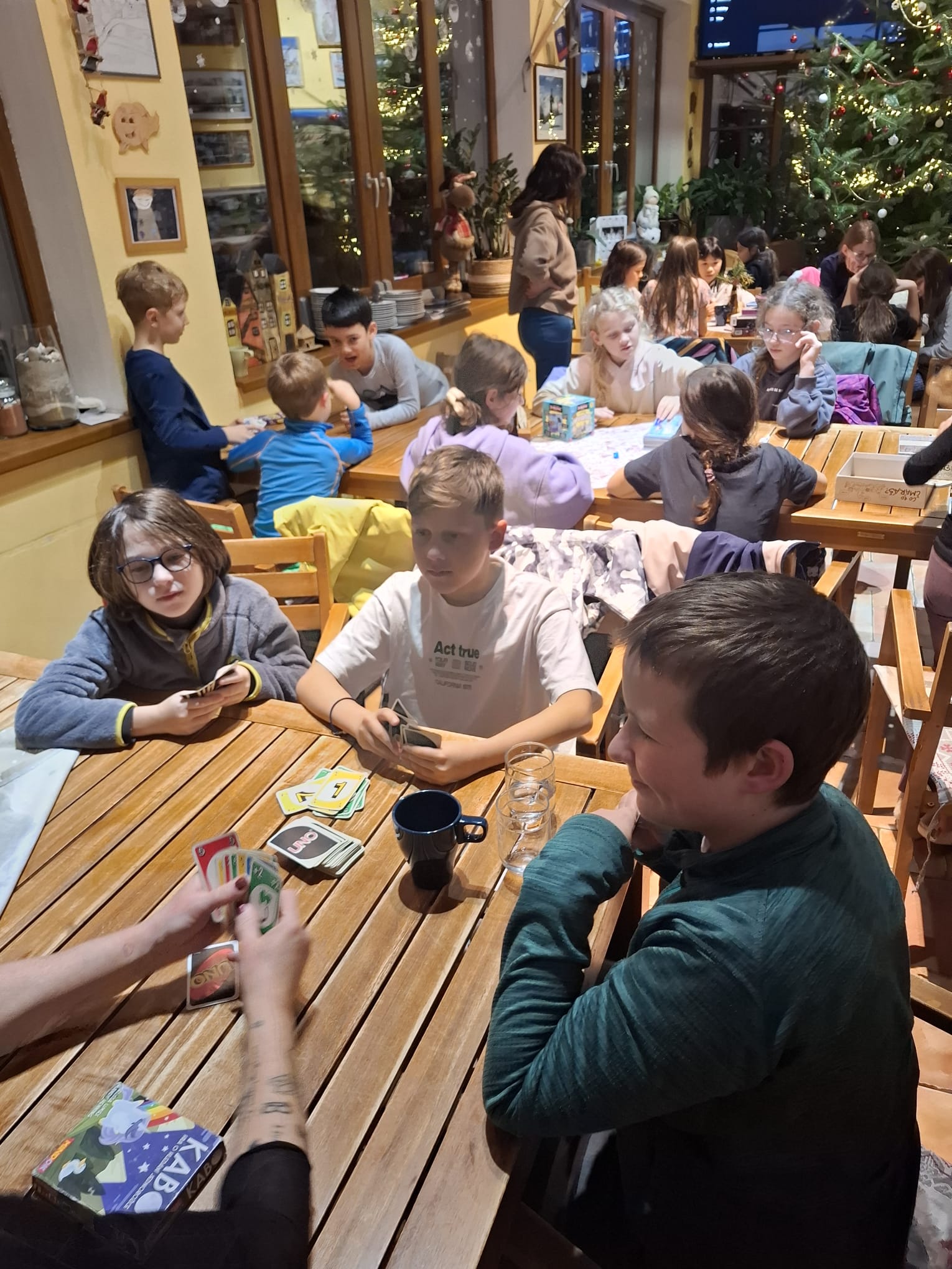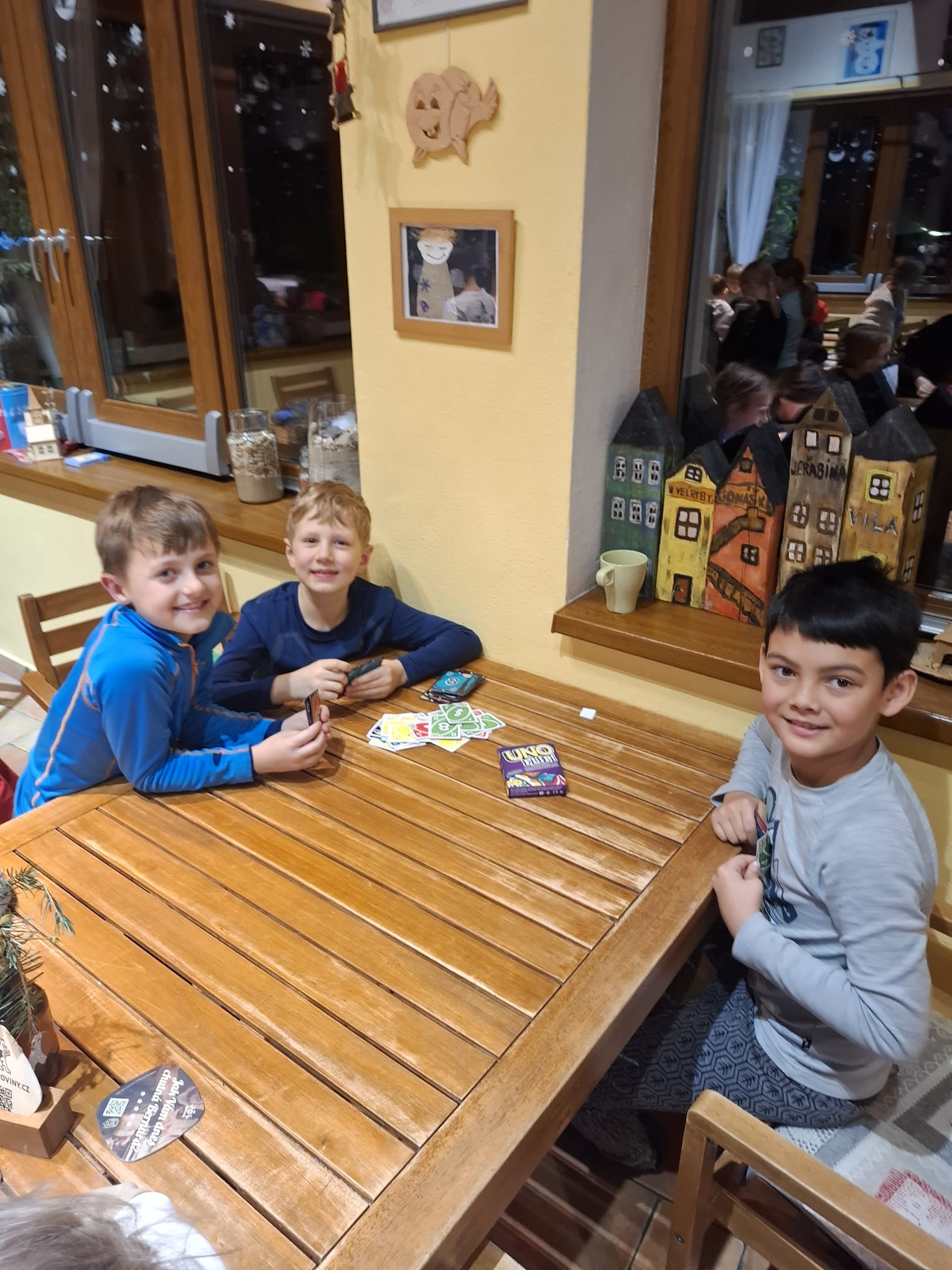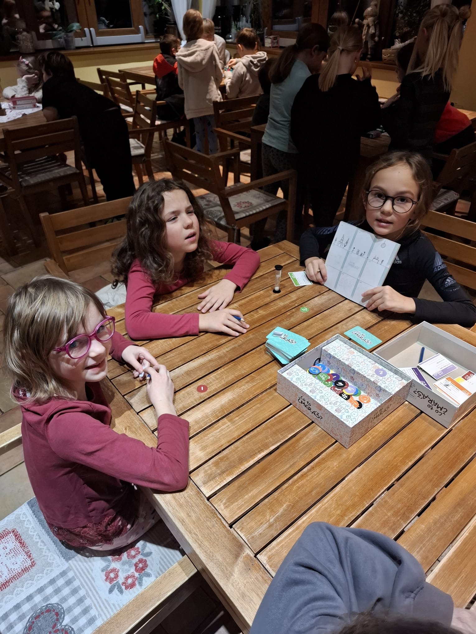 Večer si děti postupně vylosovaly svá startovní čísla na zítřejší závody, na které se už všichni moc těší. Den jsme zakončili příjemnou atmosférou u deskových her, smíchem a dobrou náladou. 😊
