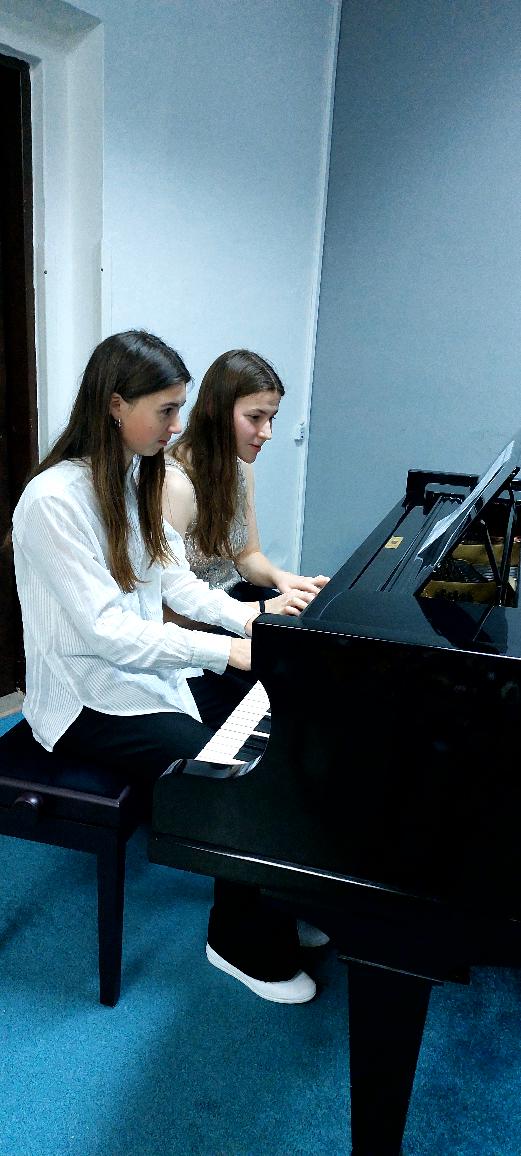 Pátá v pořadí vystoupila Valerie Dvořáková (2.II.st.) se známou písní Okoř a následně v rámci předmětu Kolektivní interpretace zahrála se svou kamarádkou Annou Červinkovou (2.II.st.) čtyřručně koledu Rolničky.
