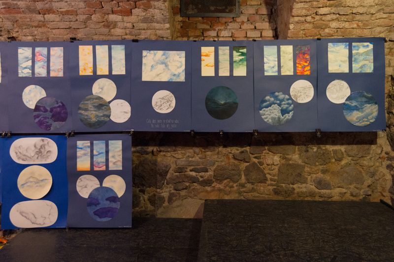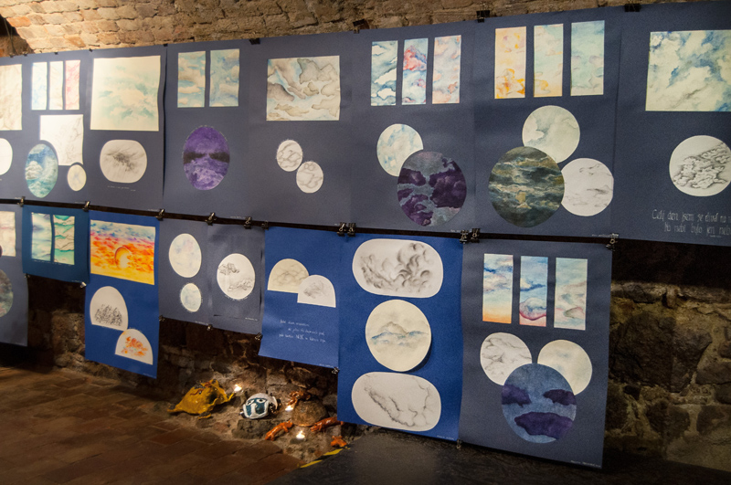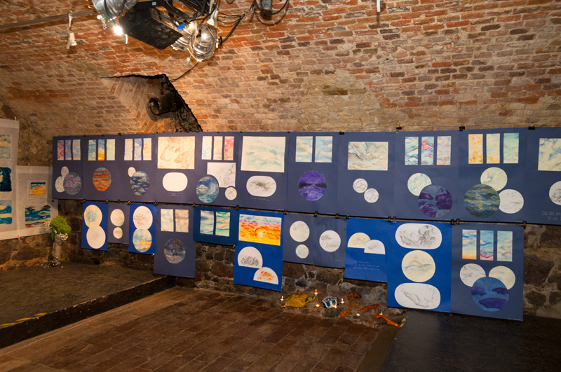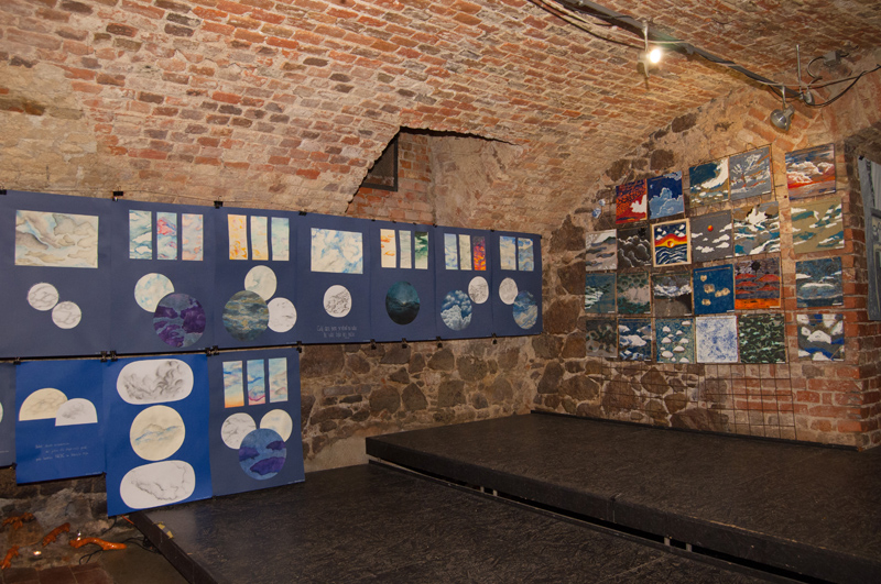 Hlavním tématem prací v prvním výstavním prostoru bylo Nebe zpracované různými technikami /kresba, akvarel, pastel, suché plstění a malba glazurami na keramické kachle/.