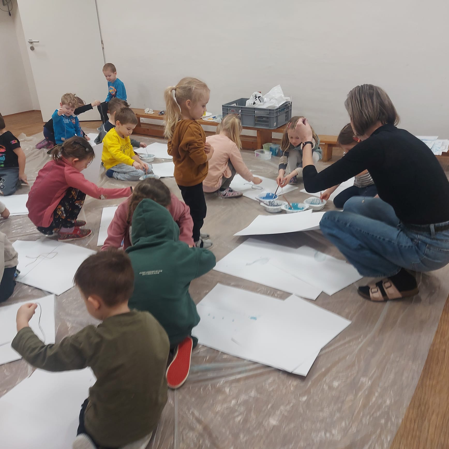Děti z MŠ Voroněžská si během února vyzkoušely netradiční výtvarnou techniku při tvorbě zimního kluziště s bruslařem. Na velký formát papíru nanášely jemné „zimní“ odstíny – pastelové tóny modré, modrozelené i šedé – pomocí provázku namáčeného v barvě. Vznikaly tak zajímavé barevné struktury připomínající ledovou plochu.