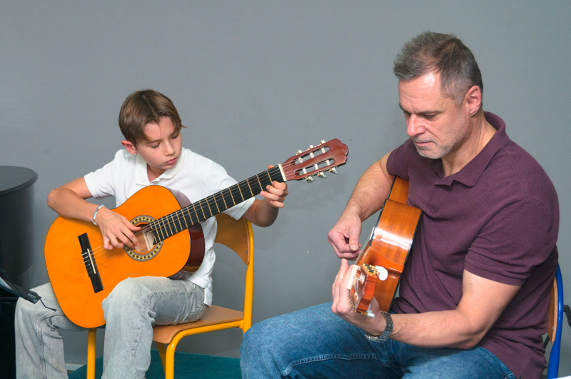 Ondřej Šplíchal (4. r., hra na kytaru, žák p. učitele Dalibora B. Hanuska) hrál společně se svým p. učitelem D. B. Hanuskem Hradní tanec Š. Raka.