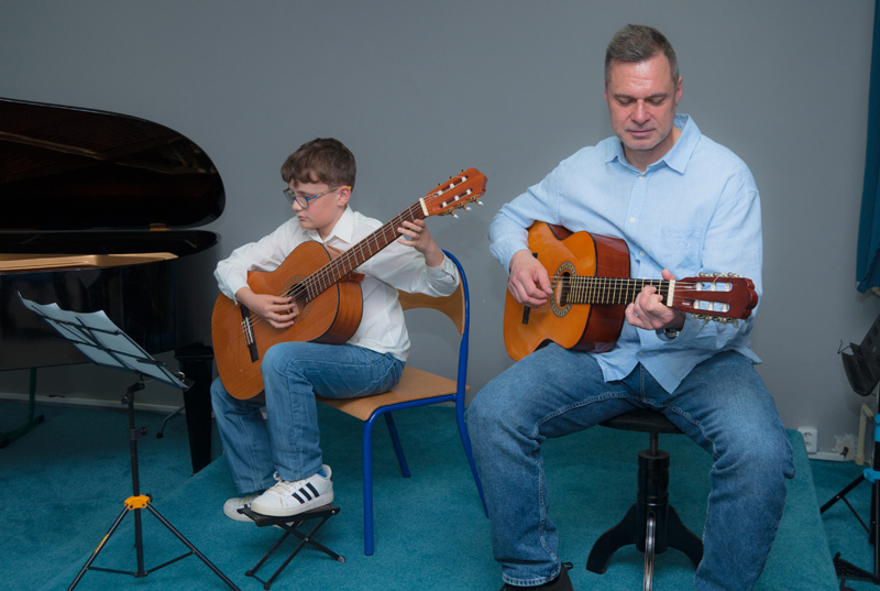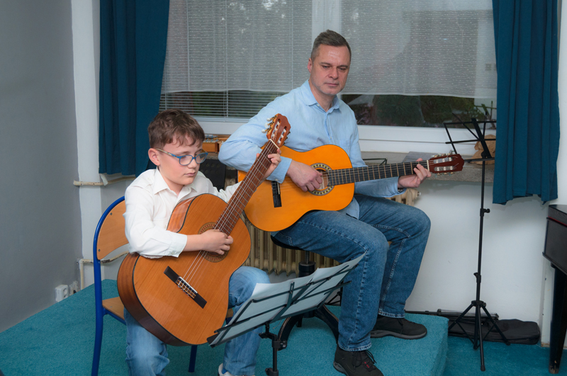 Radek Kaisler (3. r., hra na kytaru, žák p. učitele Dalibora B. Hanuska) přednesl Dumku Ctibora Süssera a v kytarové souhře se svým p. učitelem Hradní tanec od Štěpána Raka.