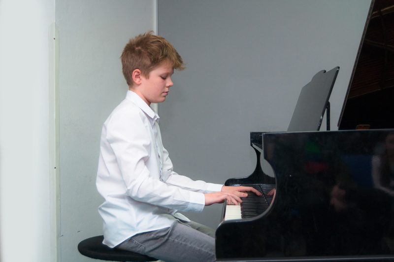Jakub Leinveber (3. r., hra na klavír, žák p. učitelky S. Horákové) hrál skladbu Autumn Sketch Williama Gillocka.