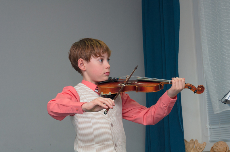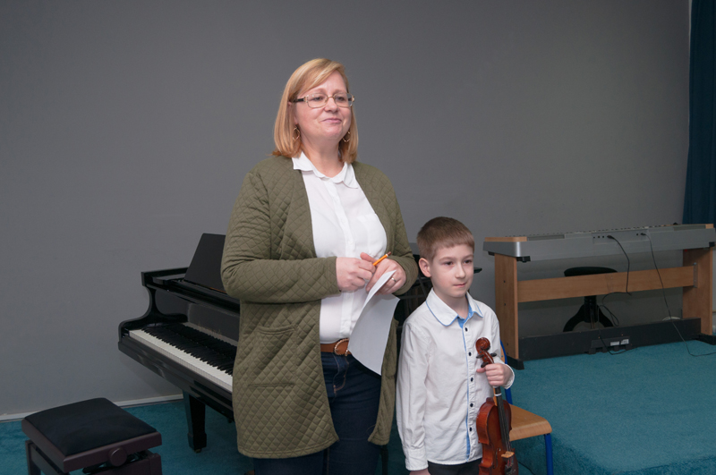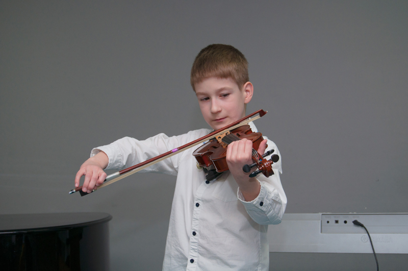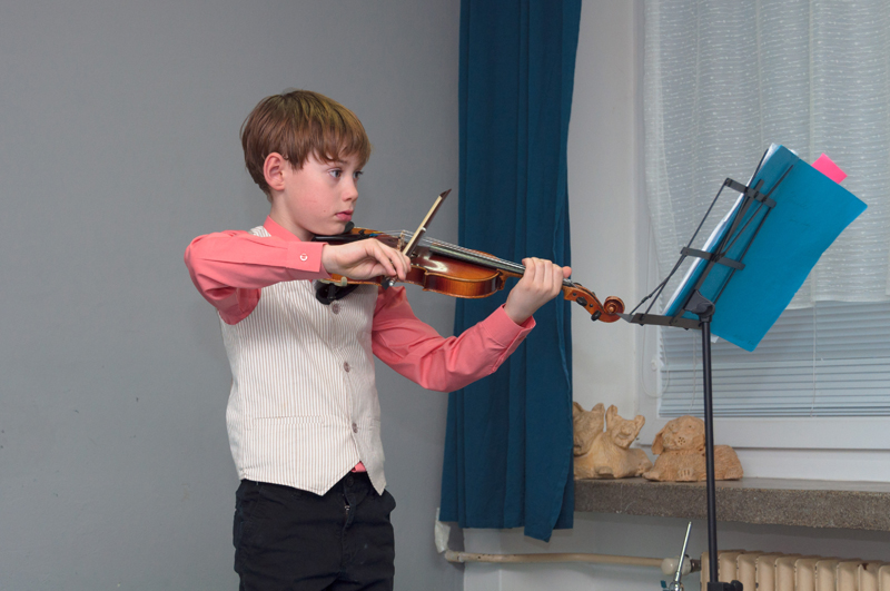 Teodor Lužný (2. r., hra na housle, žák p. učitelky Jany Gofrýdové) přednesl Píseň J. B. Lullyho a melodii populární písně Slavíci z Madridu.