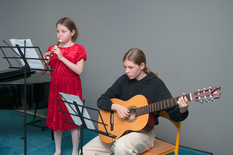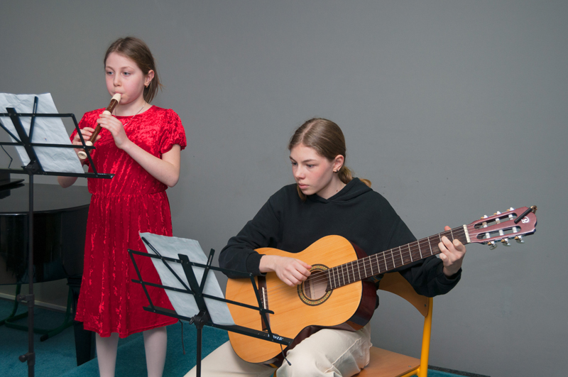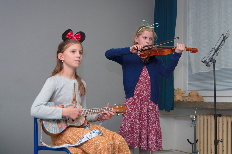 a Rainbow. Alice hraje na zobcovou flétnu (2. r., žákyně p. učitelky Natálie Železníkové), Jolana hraje na kytaru (5. r., žákyně p. učitele V. Dudka).
