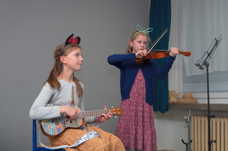 p. J. Gotfrýdové. Anetka se sestrou Jůlinkou, která hrála na ukulele, věnovala dnešní vystoupení své mamince, která slavila právě dnes kulaté narozenin.