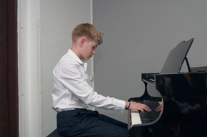 Kryštof Šimek (5. r., hra na klavír, žák p. učitelky Saskie Horákové) zahrál výborně nastudovaný Walzer a moll E. Griega.