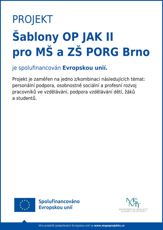 V rámci dotace OP JAK získala škola PORG Brno, gymnázium, základní škola a mateřská škola, o.p.s., projekt Šablony OP JAK II pro MŠ a ZŠ PORG Brno s registračním číslem CZ.02.02.XX/00/24_034/0011265.