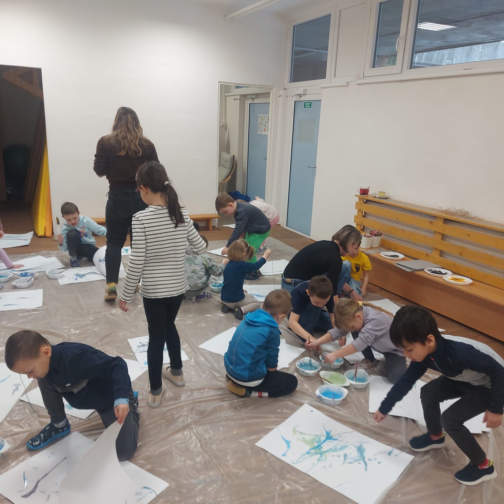 Děti z MŠ Voroněžská si během února vyzkoušely netradiční výtvarnou techniku při tvorbě zimního kluziště s bruslařem. Na velký formát papíru nanášely jemné „zimní“ odstíny – pastelové tóny modré, modrozelené i šedé – pomocí provázku namáčeného v barvě. Vznikaly tak zajímavé barevné struktury připomínající ledovou plochu.